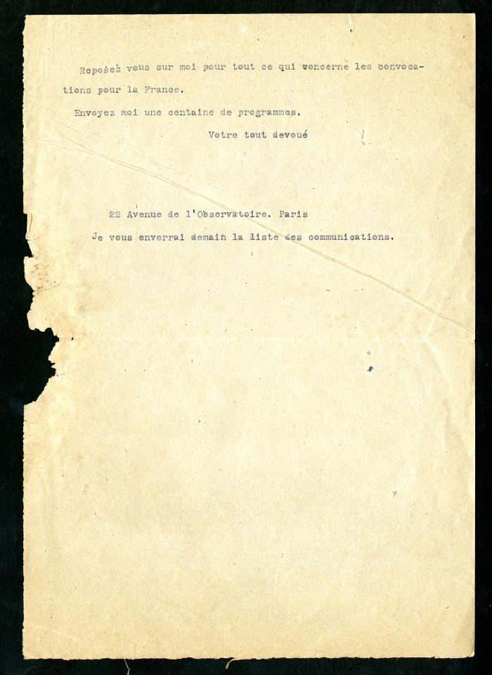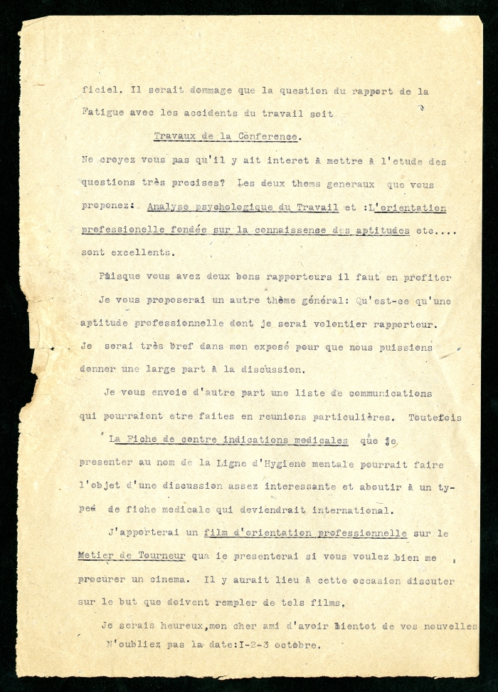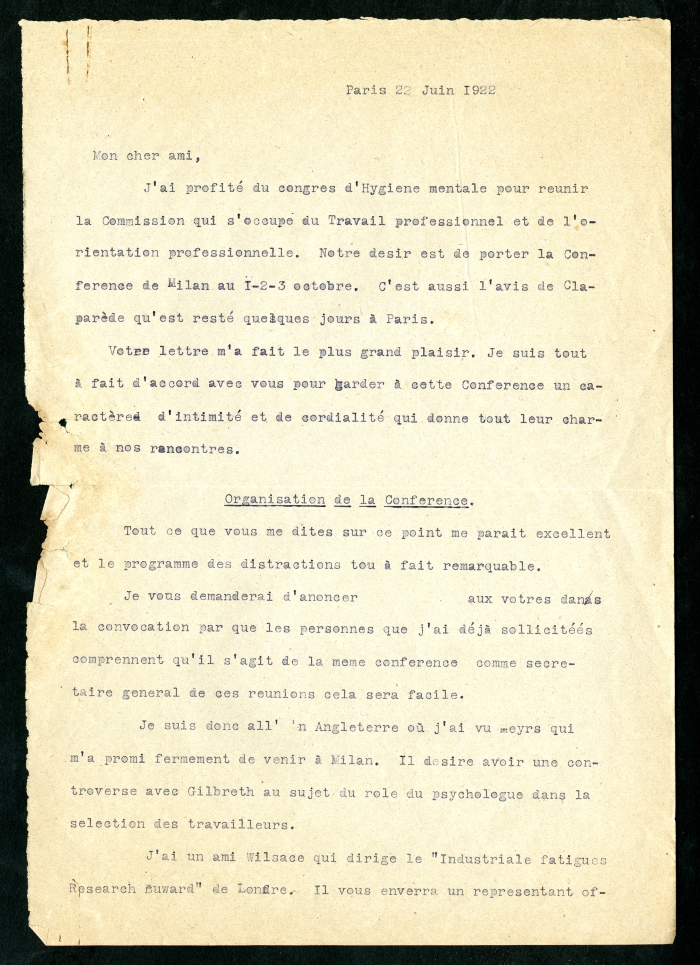 2) 22 Avenue de l’Observatoire, Parigi, 22 giugno 1922: dice di aver approfittato del congresso di Igiene mentale per riunire la commissione che si occupa di lavoro ed orientamento professionale e che vorrebbe fare una conferenza a Milano nei primi tre giorni di ottobre. Sottolinea di voler discutere con Frank Bunker Gilbreth sulla selezione dei lavoratori e di voler approfondire il rapporto tra la fatica e gli incidenti sul lavoro. Propone un tema generale per la conferenza e afferma di essere disposto a proiettare un film di orientamento professionale; assicura di poter inviare a breve la lista precisa delle comunicazioni.
