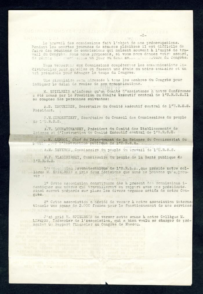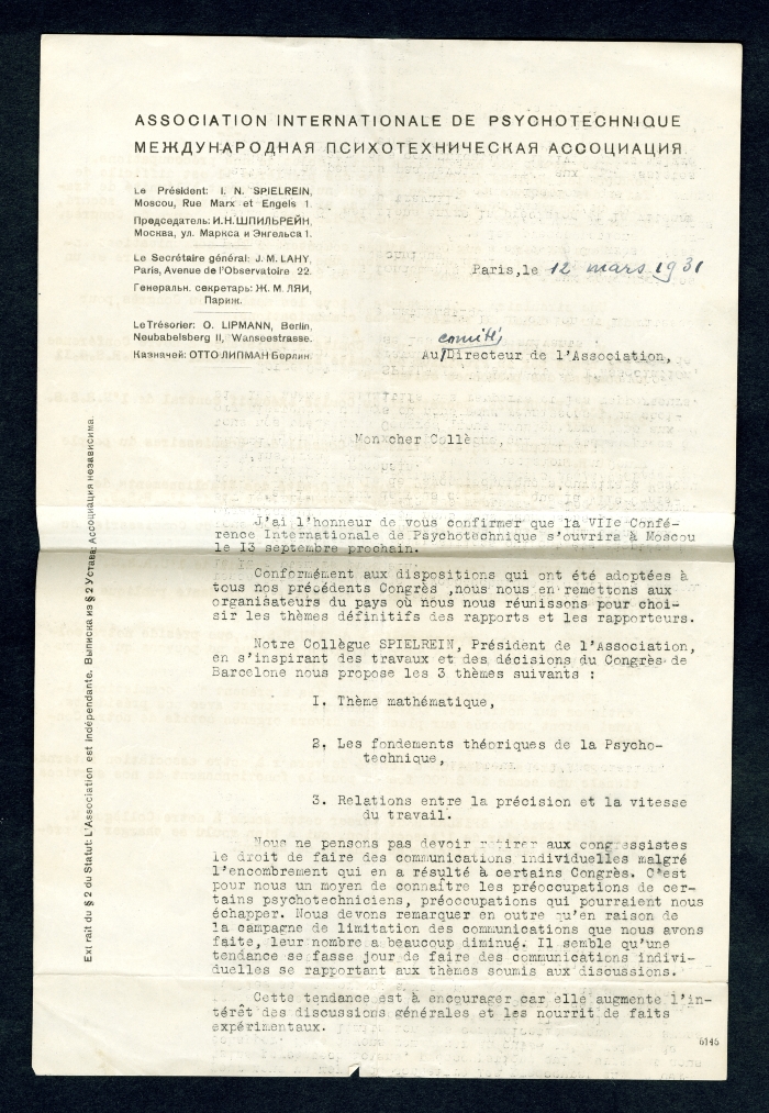 7) Paris, 12 marzo 1931: annuncia che la VIII Conferenza internazionale di psicotecnica si aprirà a Mosca il 13 settembre e riporta i temi di discussione proposti dal presidente [Isaak Naftulovich] Spielrein; elenca infine i componenti del Comitato d'assistenza nominato dal Comitato esecutivo centrale dell'URSS.