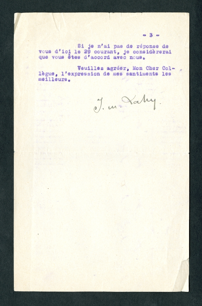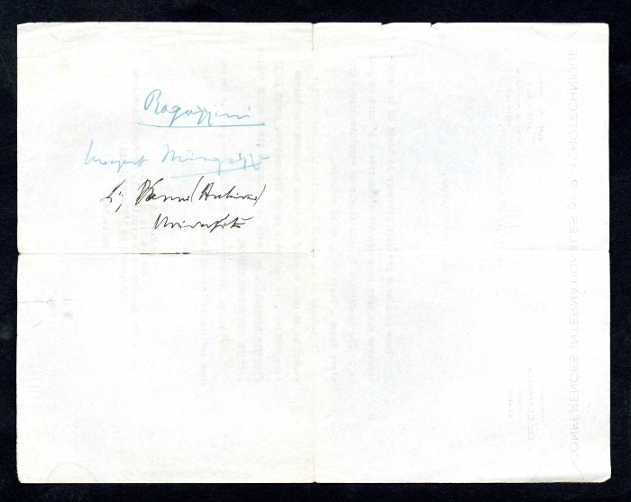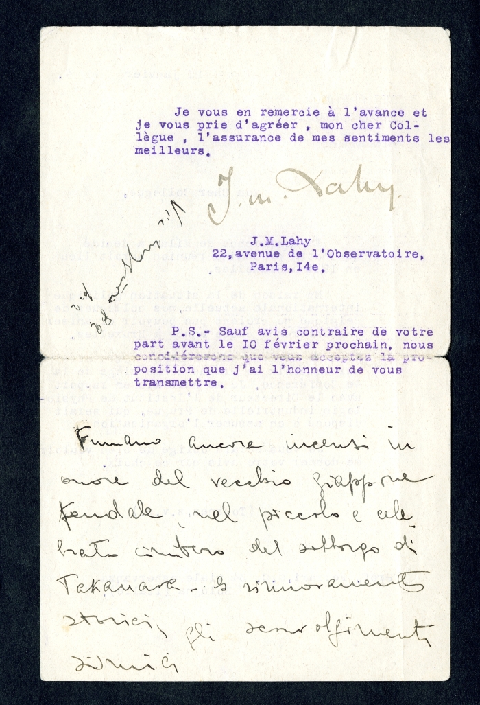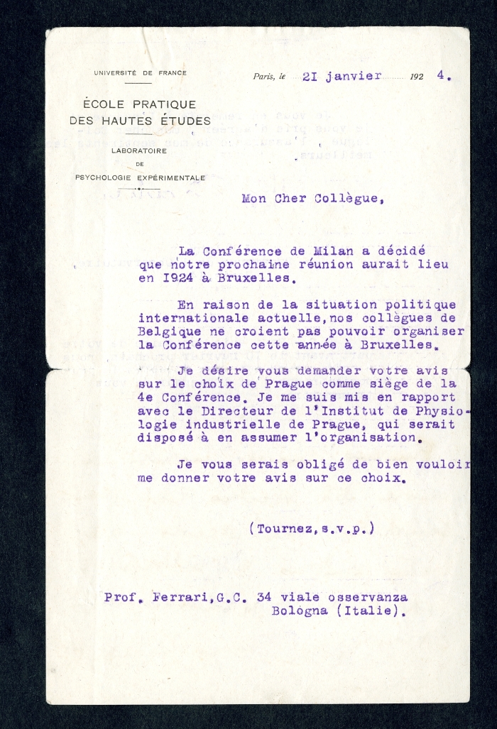 3) Paris, 21 gennaio 1924: avvisa che la Conferenza di Milano ha fissato la prossima riunione a Bruxelles nel 1924, ma che i colleghi belgi, a causa della situazione politica, non possono organizzarla. Chiede dunque a Ferrari un parere sulla sede di Praga, dove ha già contattato il direttore dell'Istituto di fisiologia industriale. Una nota manoscritta, senza firma, commenta in calce: "Fumano ancora incensi in onore del vecchio Giappone feudale, nel piccolo e celebrato cimitero di Takanava. I rinnovamenti storici, gli sconvolgimenti sismici".