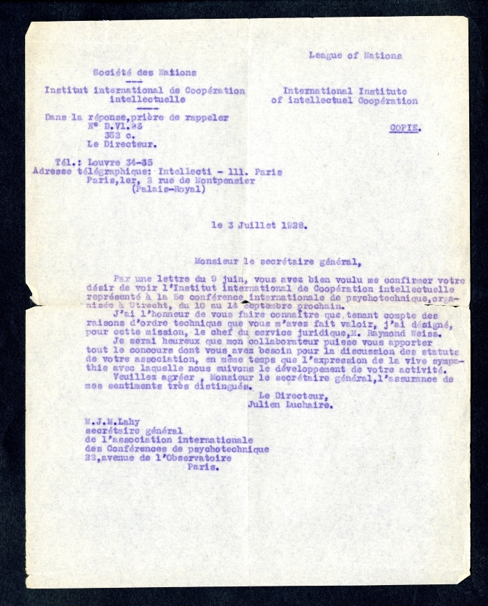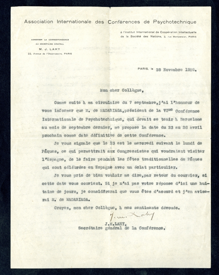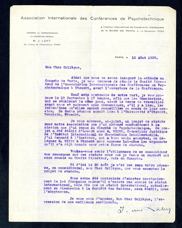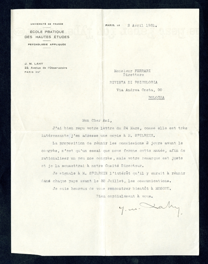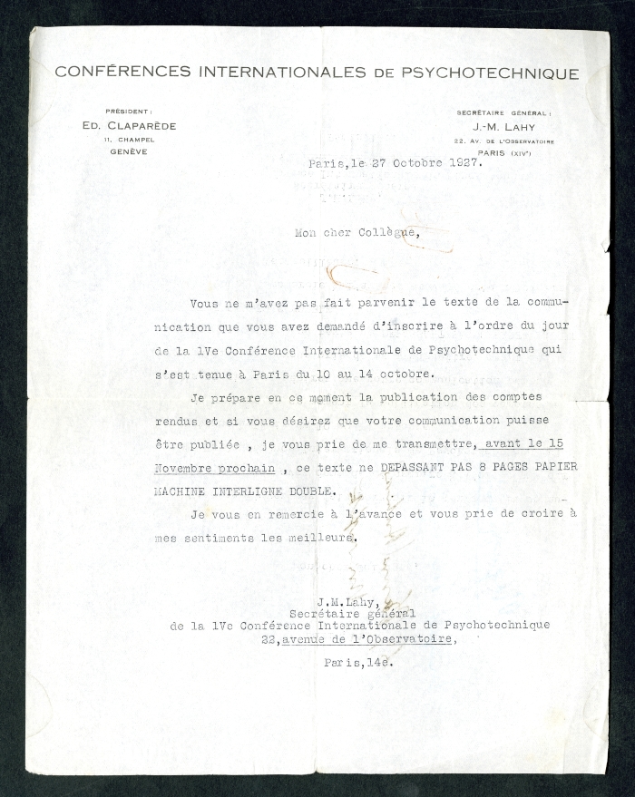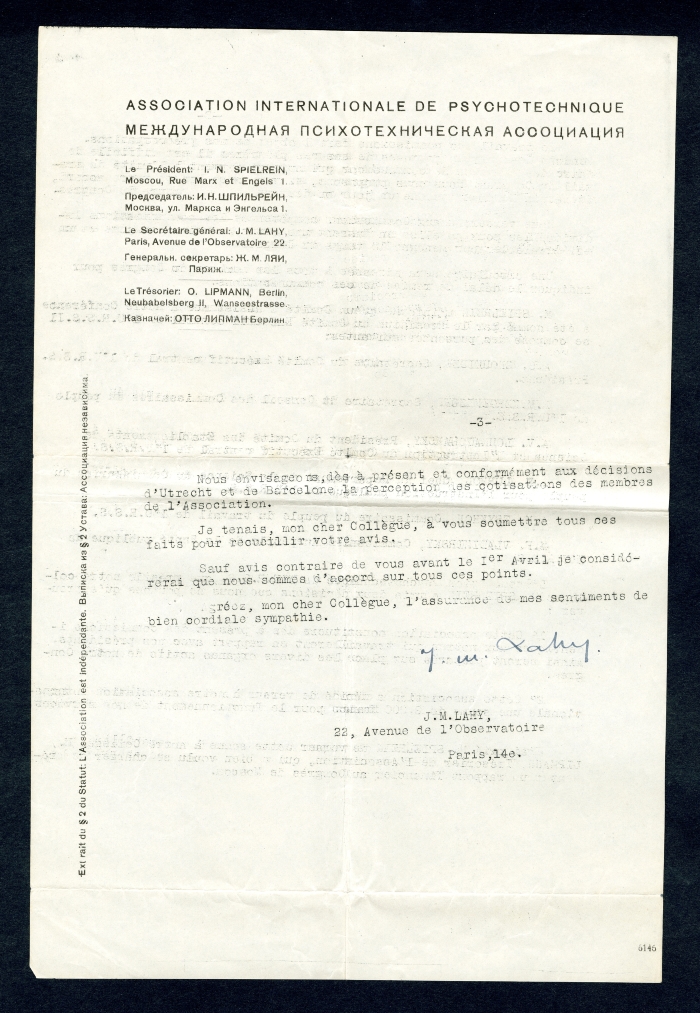 Carta intestata: "Université de France / Ecole pratique / des Hautes études / Laboratoire / de / psychologie expérimentale"; "Conférences internationales de psychotecnique / Président: / Ed. Claparède / 11, Champel / Genève / Sécretaire géneral: / J.M. Lahy / 22, Av. de l'Observatoire / Paris (XIVe)"; "Association Internationale des Conférences de psychotecnique / à l'Institut International de Coopération Intellectuelle / de la Socieété des Nations, 2, rue Montpensier, Paris / Adresser la correspondance / au secrétaire général / M.J. Lahy / 22, Avenue de l'Observatoire, Paris"; "Association Internationale de psychotecnique / Le président: I.N. Spielrein, / Moscou, Rue Marx et Engels 1 / Le secrétaire général: J.M. Lahy / Paris, Avenue de l'Observatoire 22 / Le trésorier: O. Lipmann, Berlin / Neubabelsberg II, Wanseestrasse" (tutta l'intestazione è riportata anche in russo); "Université de France / Ecole pratique / des Hautes études / Psychologie appliquée / J.M. Lahy / 22, Avenue de l'Observatoire / Paris (XIVe)".