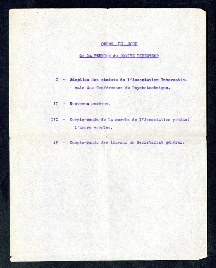 5) Paris, 10 agosto 1928: avvisa che la riunione del Comitato direttivo dell'Associazione internazionale delle conferenze di psicotecnica si terrà a Utrecht il 10 settembre prima dell'apertura della Conferenza. Gli invia per eventuali correzioni il progetto di statuto dell'Associazione, redatto insieme a M. Raymond Weiss, consigliere giuridico dell'Istituto internazionale di cooperazione intellettuale, e una copia della lettera ricevuta dal direttore dell'Istituto stesso Julien Luchaire (conservata nel fascicolo insieme all'ordine del giorno della riunione).