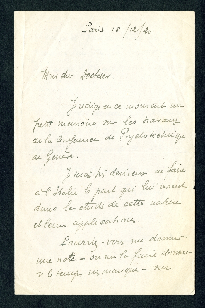 1) Paris, 18 dicembre 1920: chiede a Ferrari una nota su ciò che è stato fatto in Italia nel campo della psicotecnica, poiché sta redigendo una memoria sui lavori della Conferenza di psicotecnica tenutasi a Ginevra.
