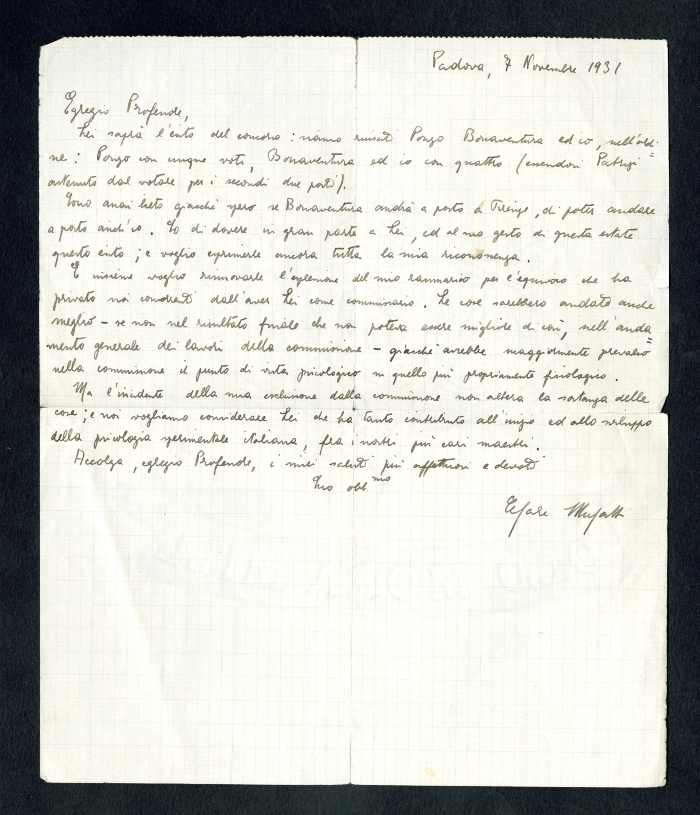 3) Padova, 7 novembre 1931: annuncia di aver vinto il concorso insieme a [Mario] Ponzo ed [Enzo] Bonaventura ed è contento poiché spera di avere il posto, dal momento che Bonaventura probabilmente andrà a Firenze. Esprime dunque la sua riconoscenza a Ferrari, nonostante si rammarichi della sua esclusione dalla commissione. Come iniziatore della psicologia sperimentale, comunque, lo considera tra i suoi più cari maestri.