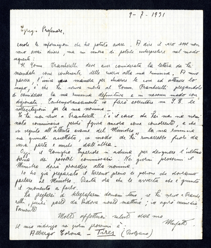 1) [Padova], 9 luglio 1931: gli invia informazioni sul malinteso con il commendatore [Ugo] Frascherelli in merito alla rinuncia di Ferrari e alla sua nomina a commissario da parte del Consiglio superiore della pubblica istruzione.