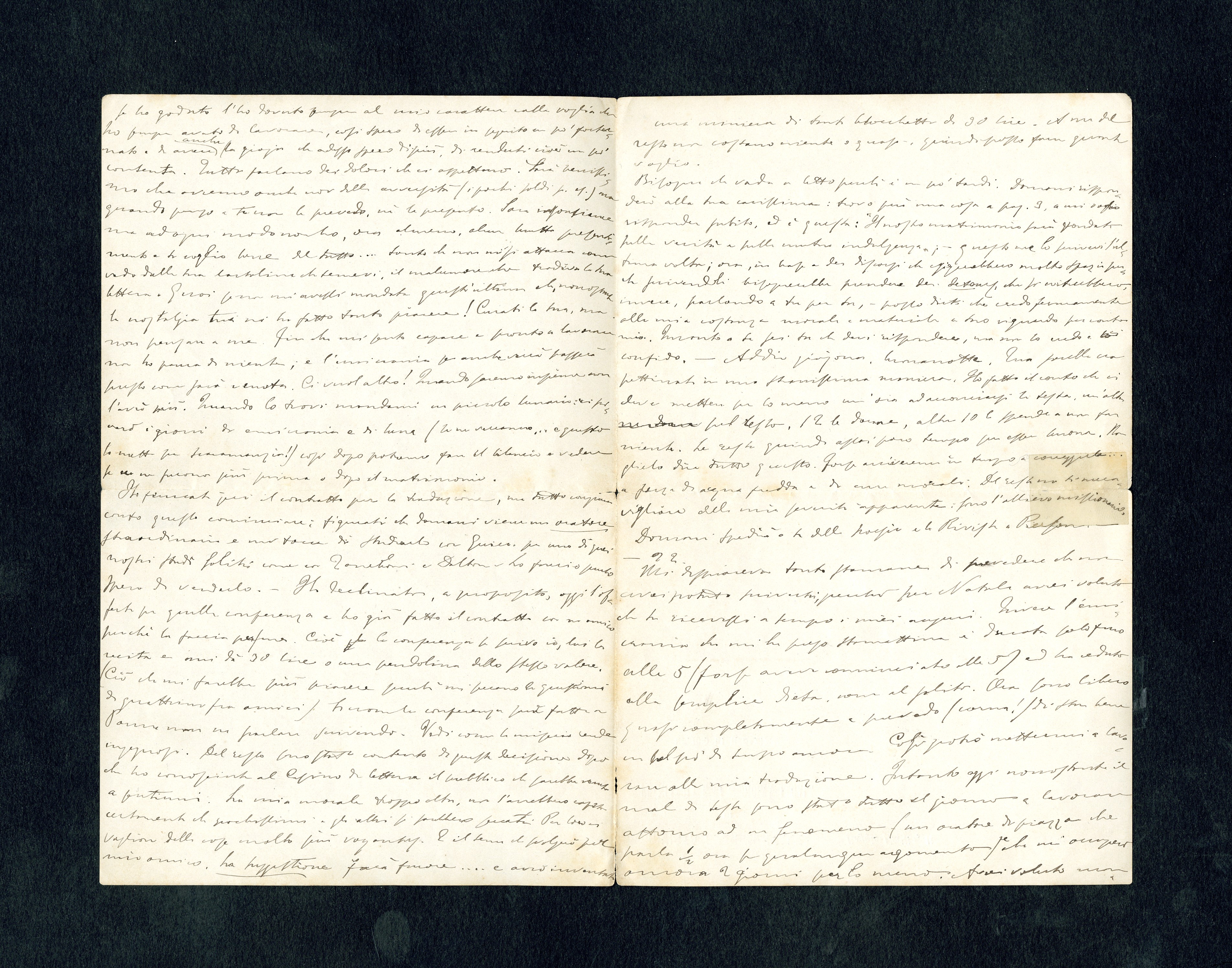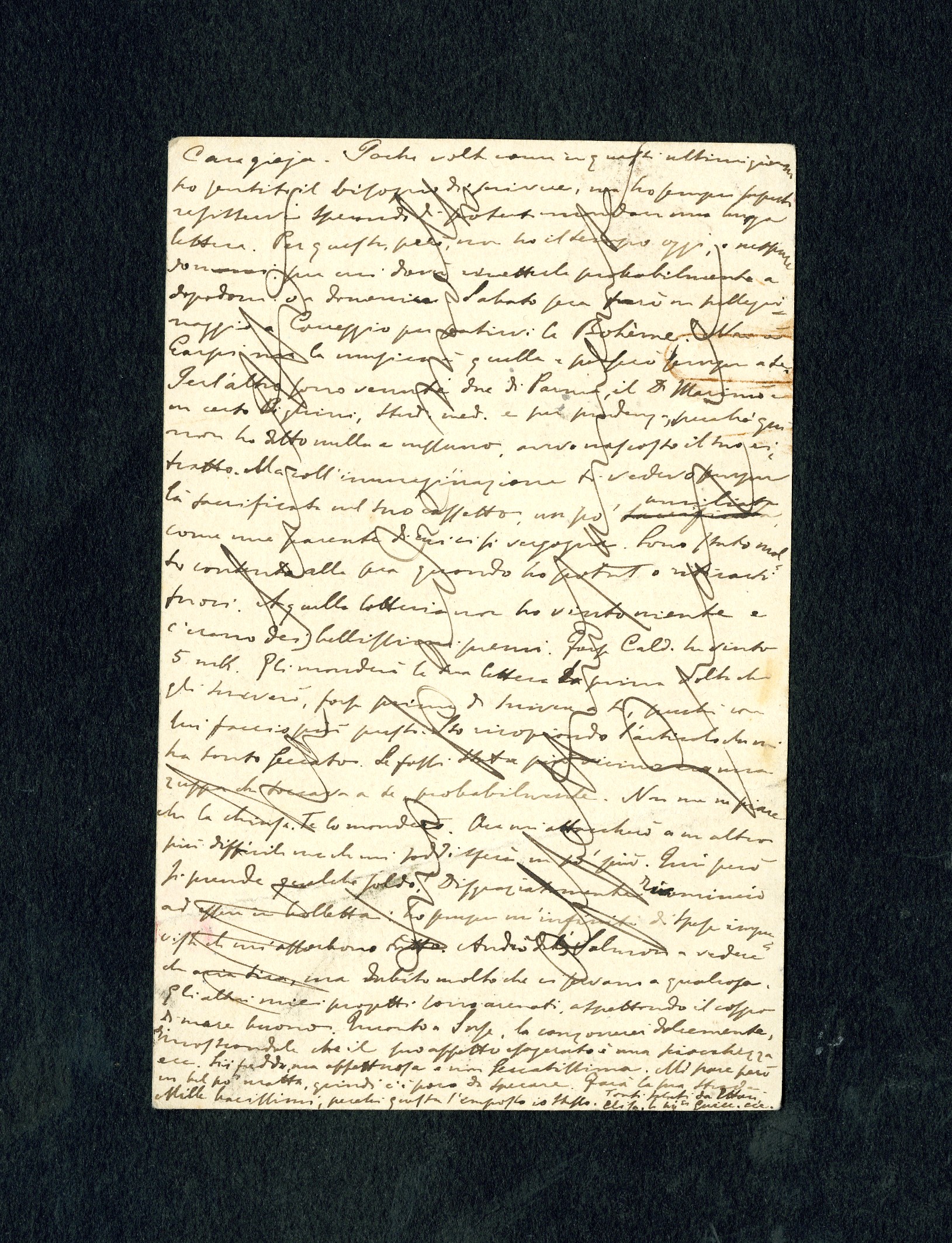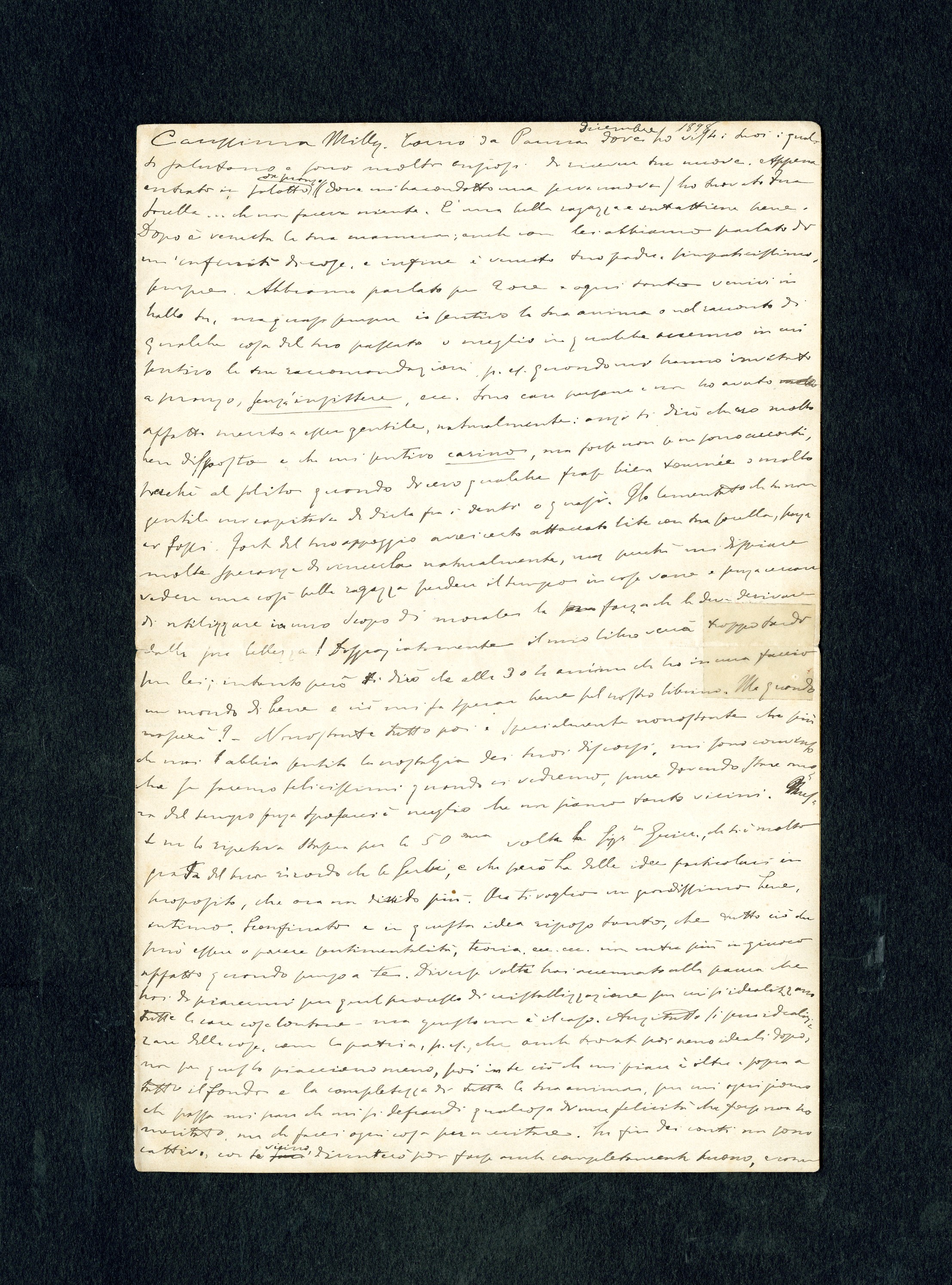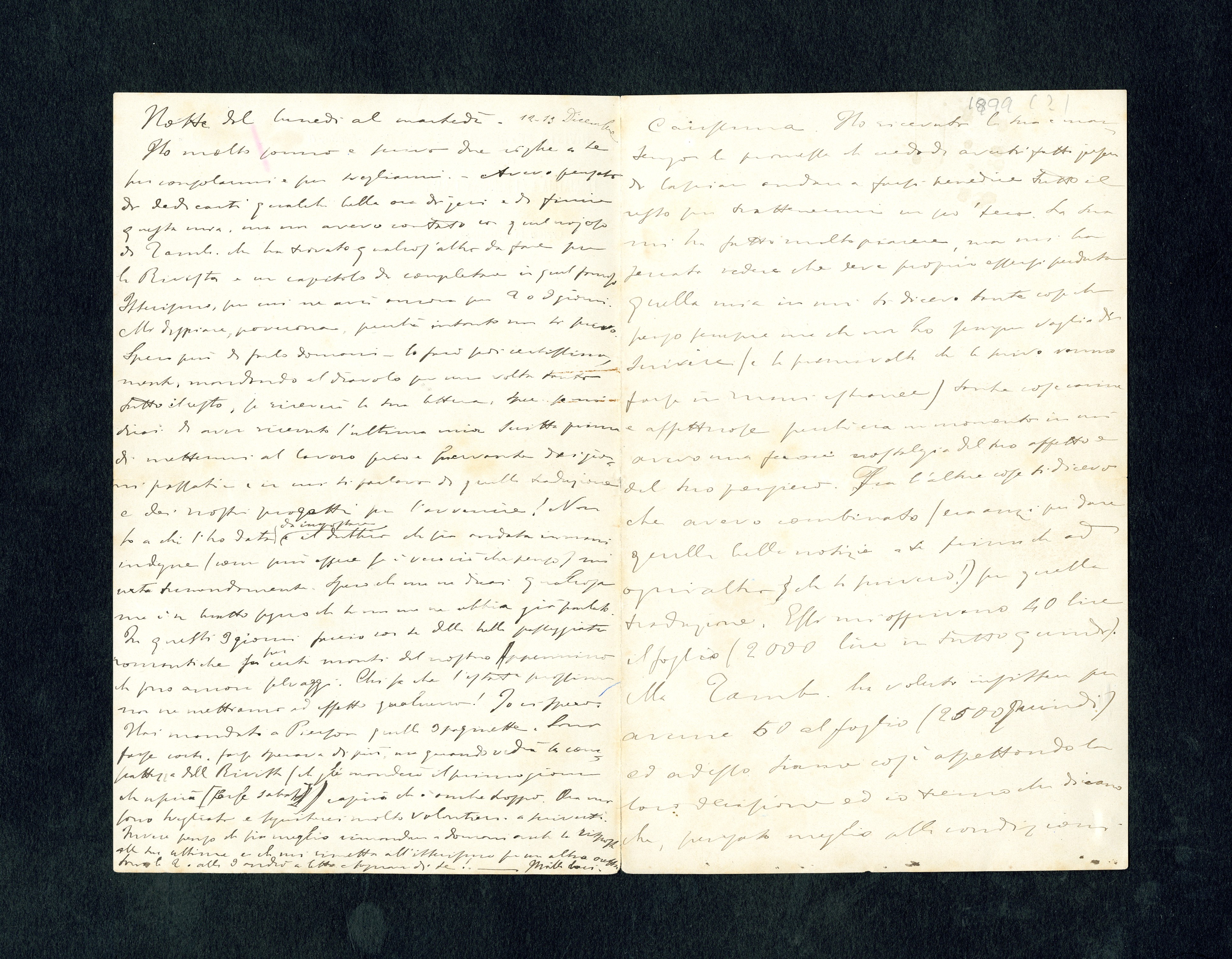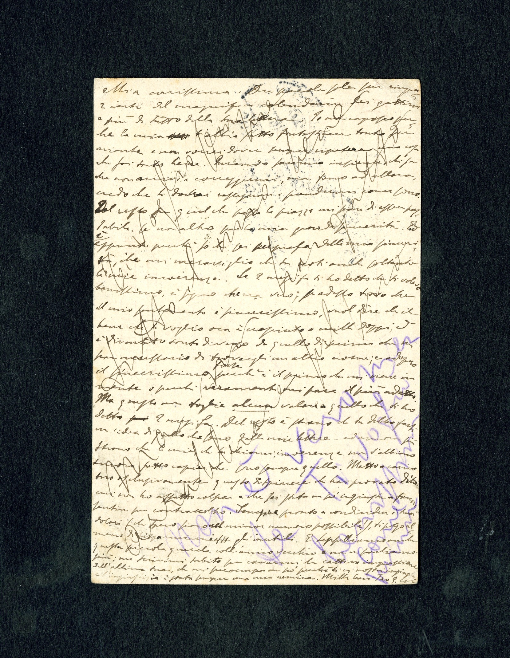 2) Reggio Emilia, dicembre 1898: le racconta di essere stato a casa Giordani, di essersi trovato bene, di aver parlato con sua madre e suo padre che è “simpaticissimo”. Notifica di aver firmato il contratto per la traduzione di James [I "Principi di psicologia" di William James] e scrive di aver lavorato “tutto il giorno [...] attorno ad un fenomeno (un oratore da piazza che parla ½ ora su qualunque argomento) e che mi occuperà ancora 2 giorni per lo meno”. Le spiega di averle mandato le poesie di Carducci come regalo di Natale, di aver spedito la Rivista a Reginald Henry Pierson e che non andrà dalla sorella Selene per la Vigilia. Le spiega di aver mostrato poco il suo ritratto per paura di perderlo e di tenerlo sempre sul suo tavolo.