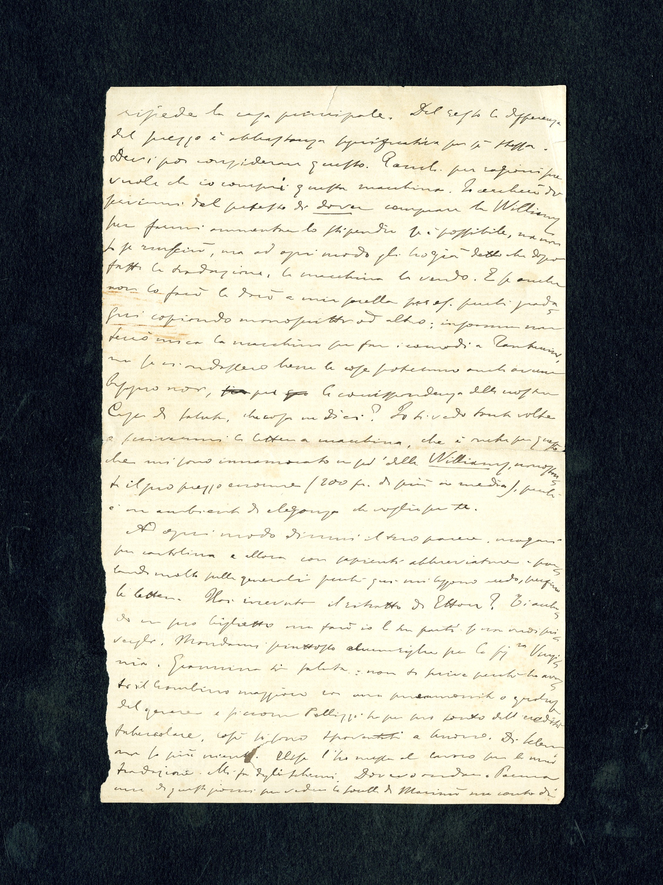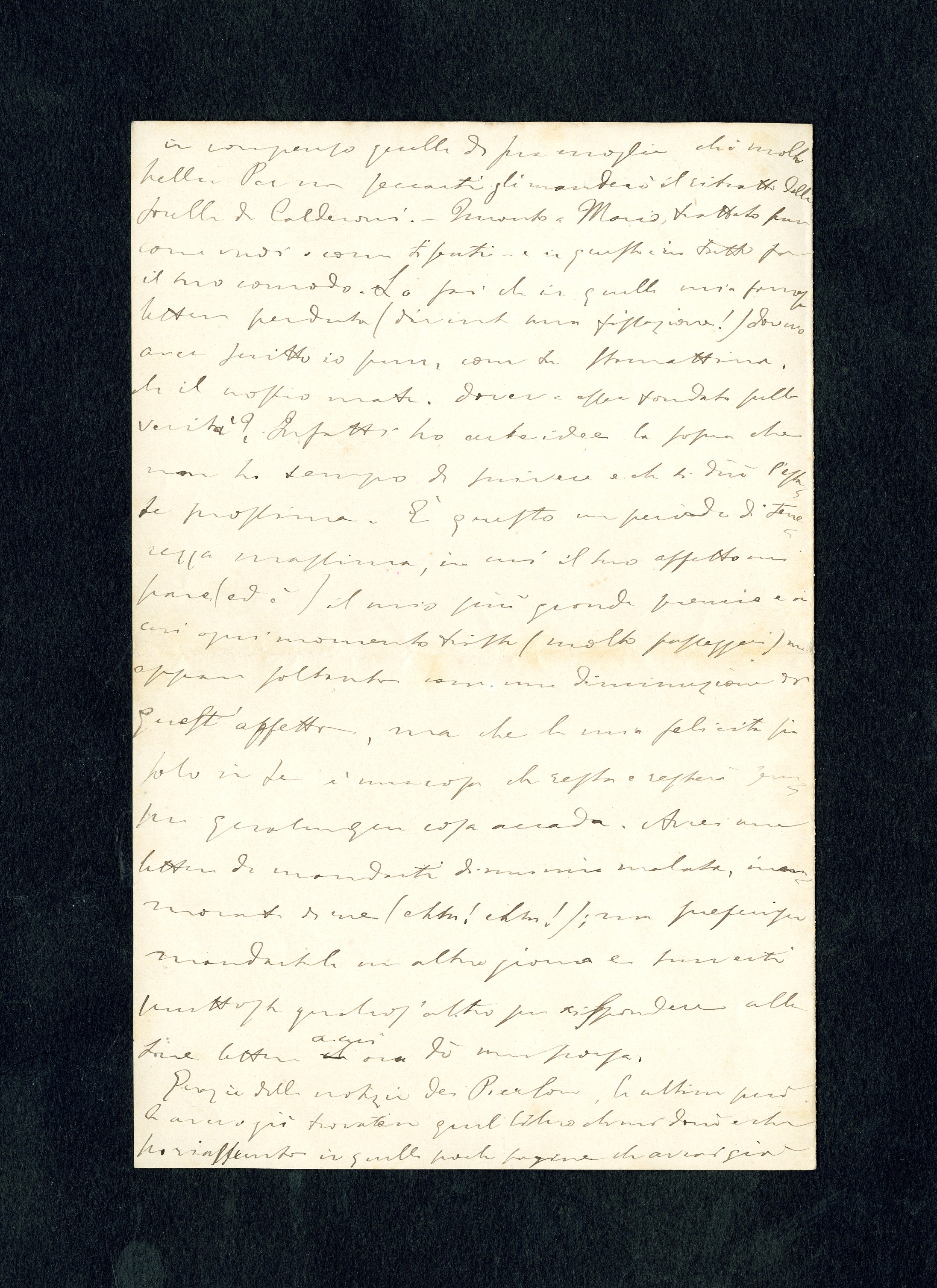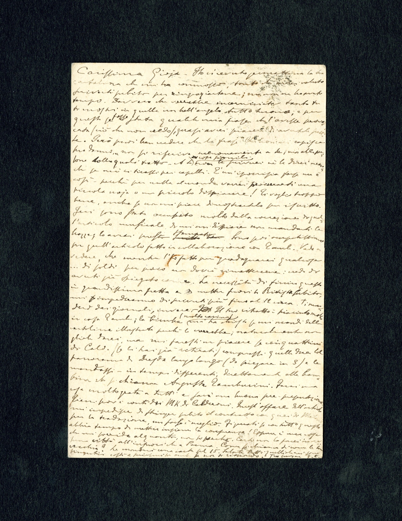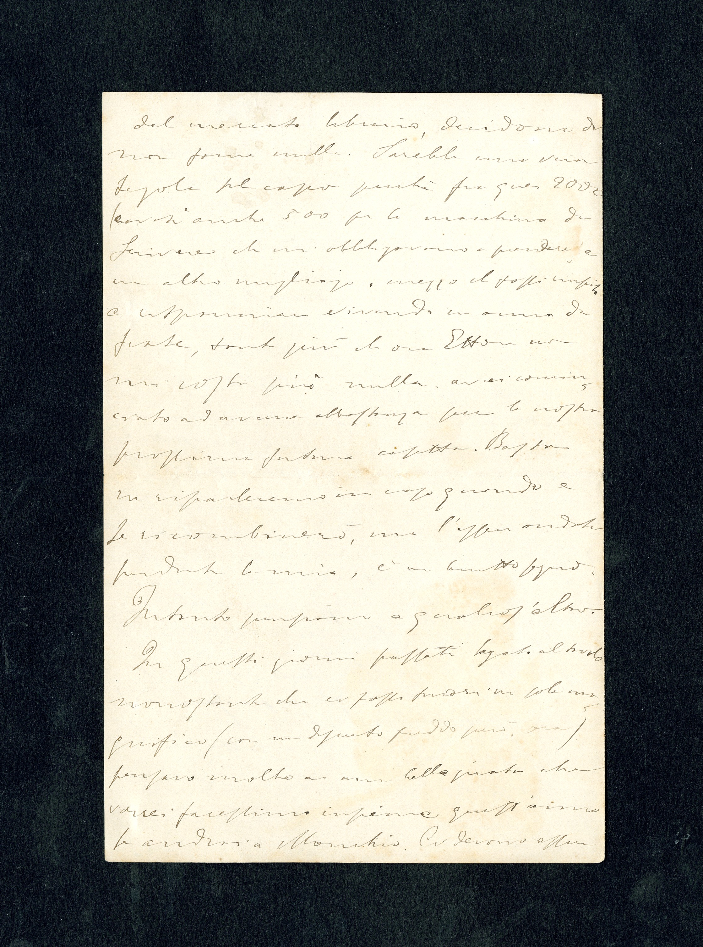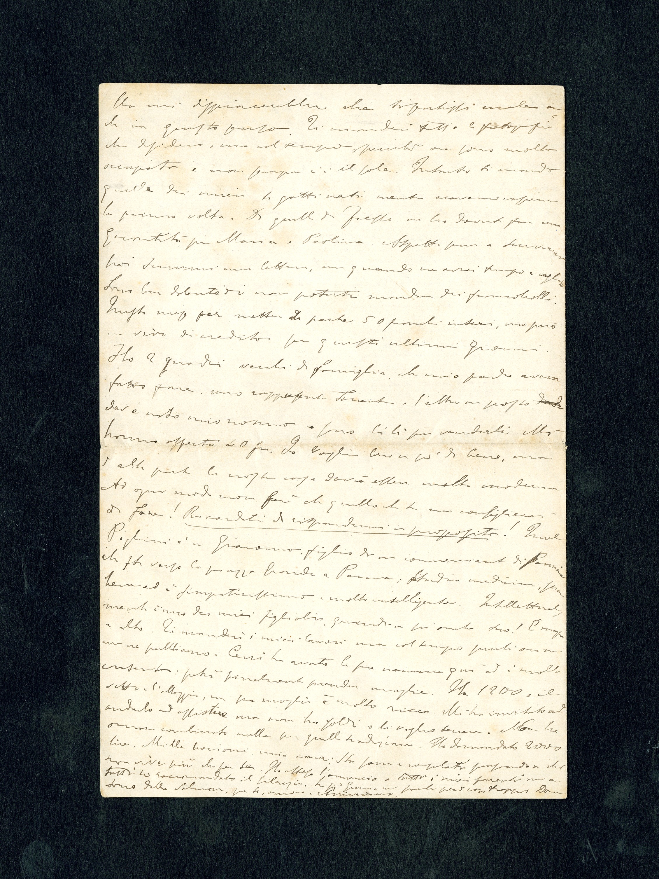 2) Reggio Emilia, dicembre 1898: le racconta di essere stato a casa Giordani, di essersi trovato bene, di aver parlato con sua madre e suo padre che è “simpaticissimo”. Notifica di aver firmato il contratto per la traduzione di James [I "Principi di psicologia" di William James] e scrive di aver lavorato “tutto il giorno [...] attorno ad un fenomeno (un oratore da piazza che parla ½ ora su qualunque argomento) e che mi occuperà ancora 2 giorni per lo meno”. Le spiega di averle mandato le poesie di Carducci come regalo di Natale, di aver spedito la Rivista a Reginald Henry Pierson e che non andrà dalla sorella Selene per la Vigilia. Le spiega di aver mostrato poco il suo ritratto per paura di perderlo e di tenerlo sempre sul suo tavolo.