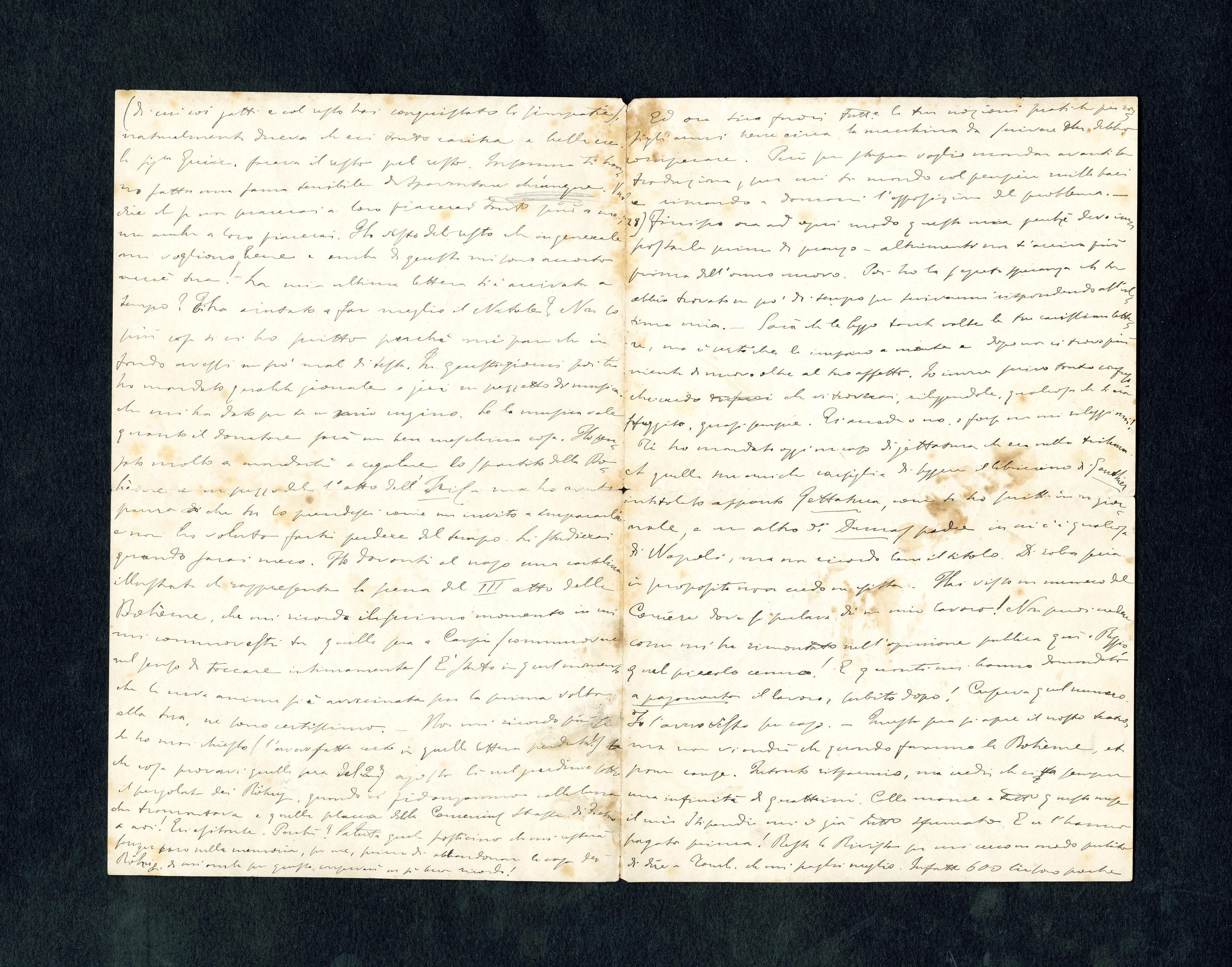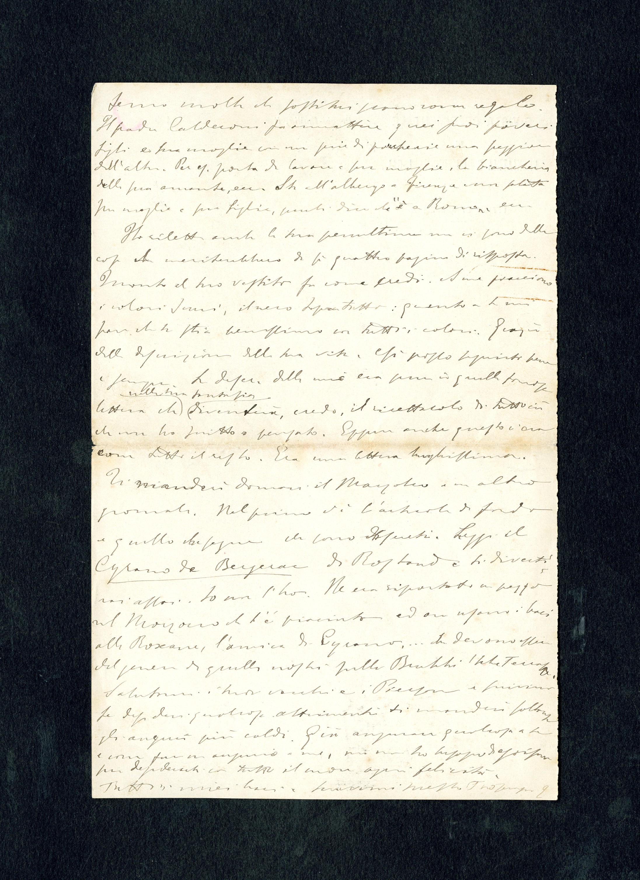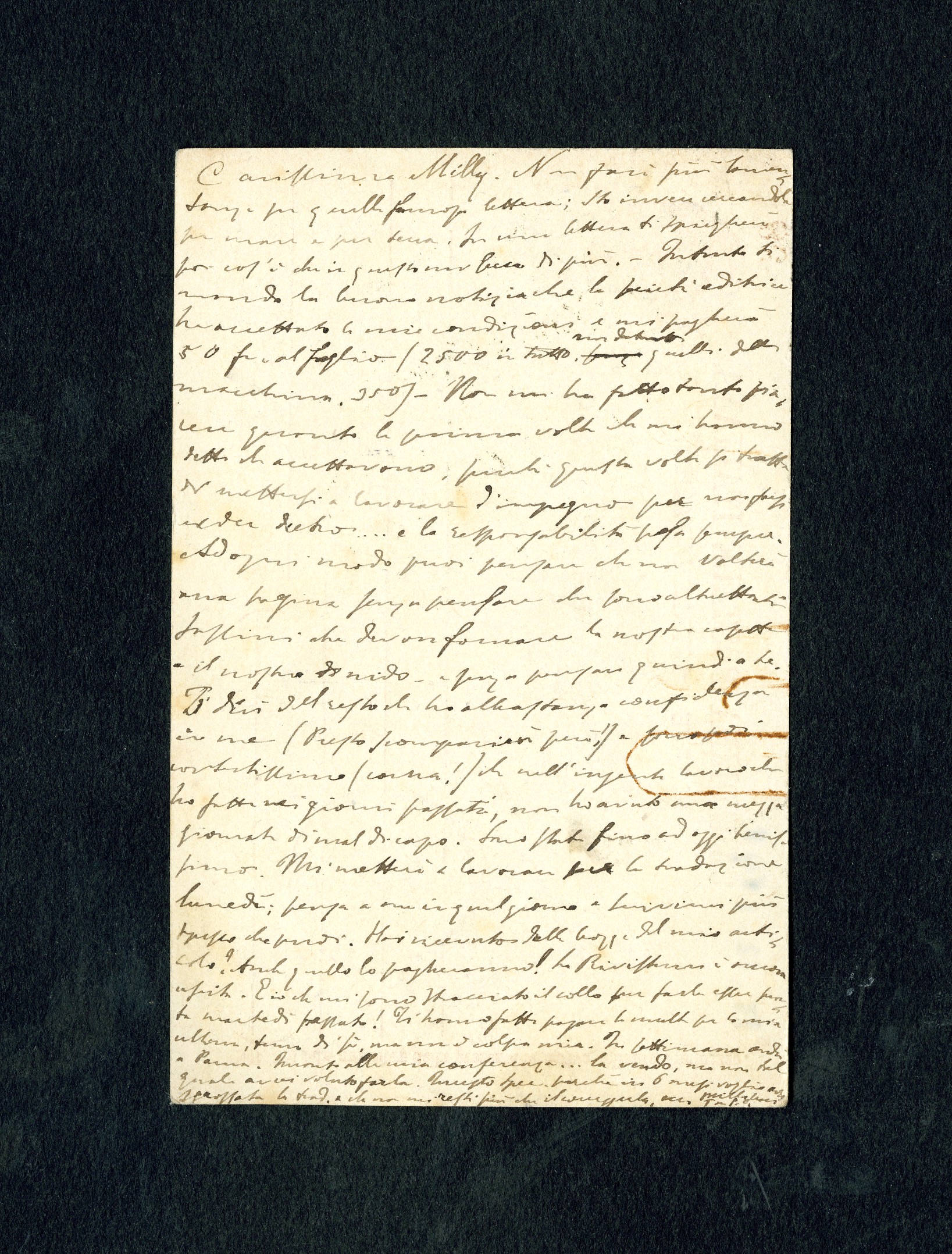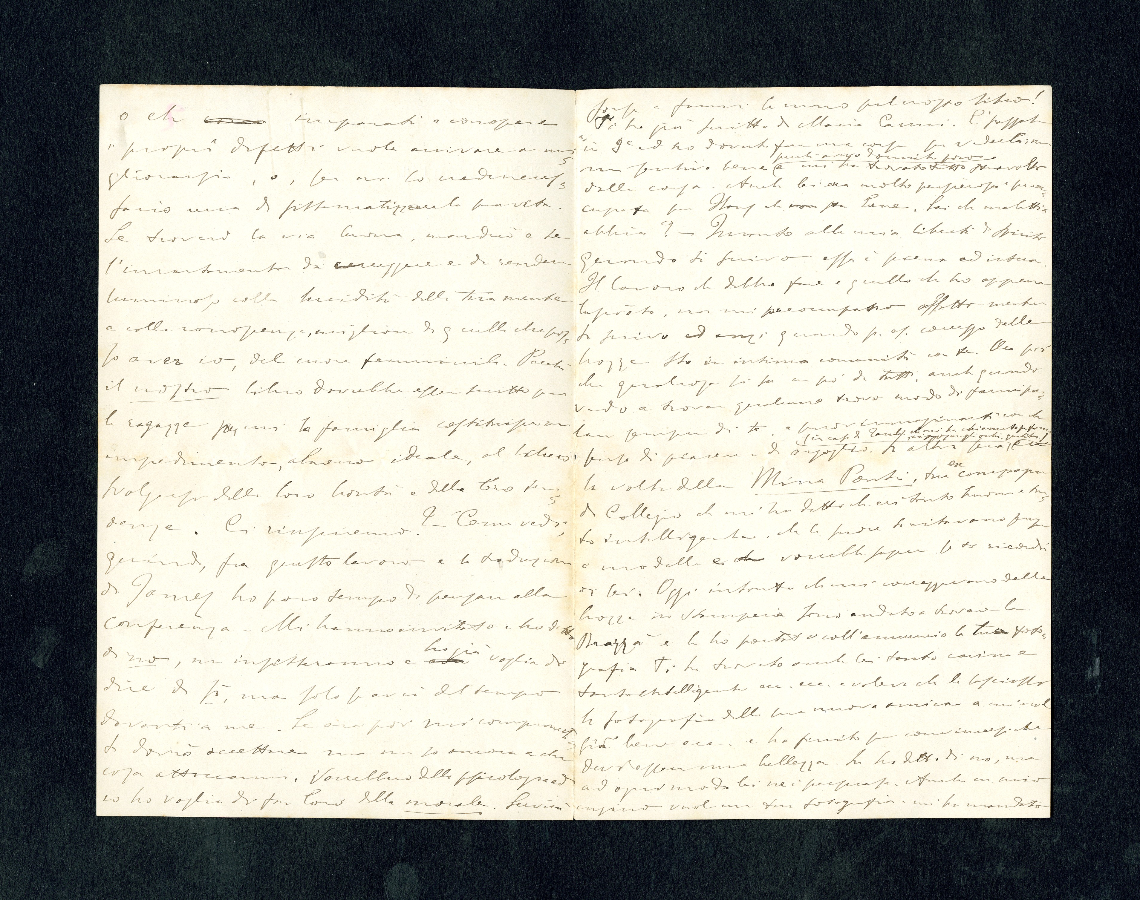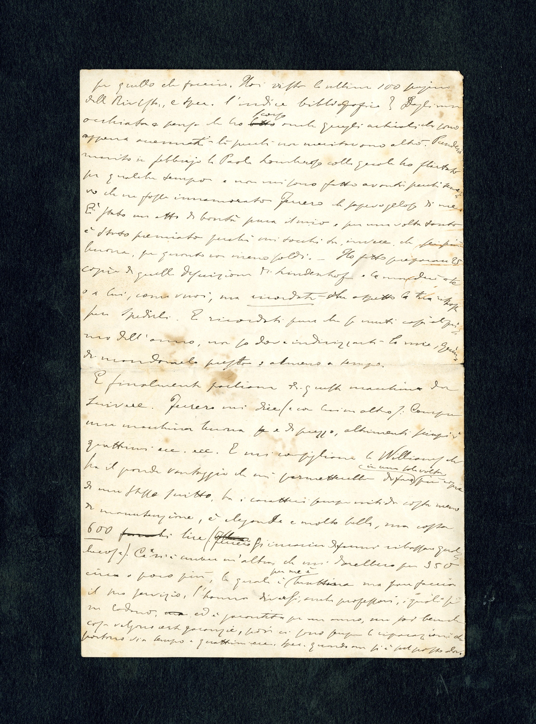 2) Reggio Emilia, dicembre 1898: le racconta di essere stato a casa Giordani, di essersi trovato bene, di aver parlato con sua madre e suo padre che è “simpaticissimo”. Notifica di aver firmato il contratto per la traduzione di James [I "Principi di psicologia" di William James] e scrive di aver lavorato “tutto il giorno [...] attorno ad un fenomeno (un oratore da piazza che parla ½ ora su qualunque argomento) e che mi occuperà ancora 2 giorni per lo meno”. Le spiega di averle mandato le poesie di Carducci come regalo di Natale, di aver spedito la Rivista a Reginald Henry Pierson e che non andrà dalla sorella Selene per la Vigilia. Le spiega di aver mostrato poco il suo ritratto per paura di perderlo e di tenerlo sempre sul suo tavolo.