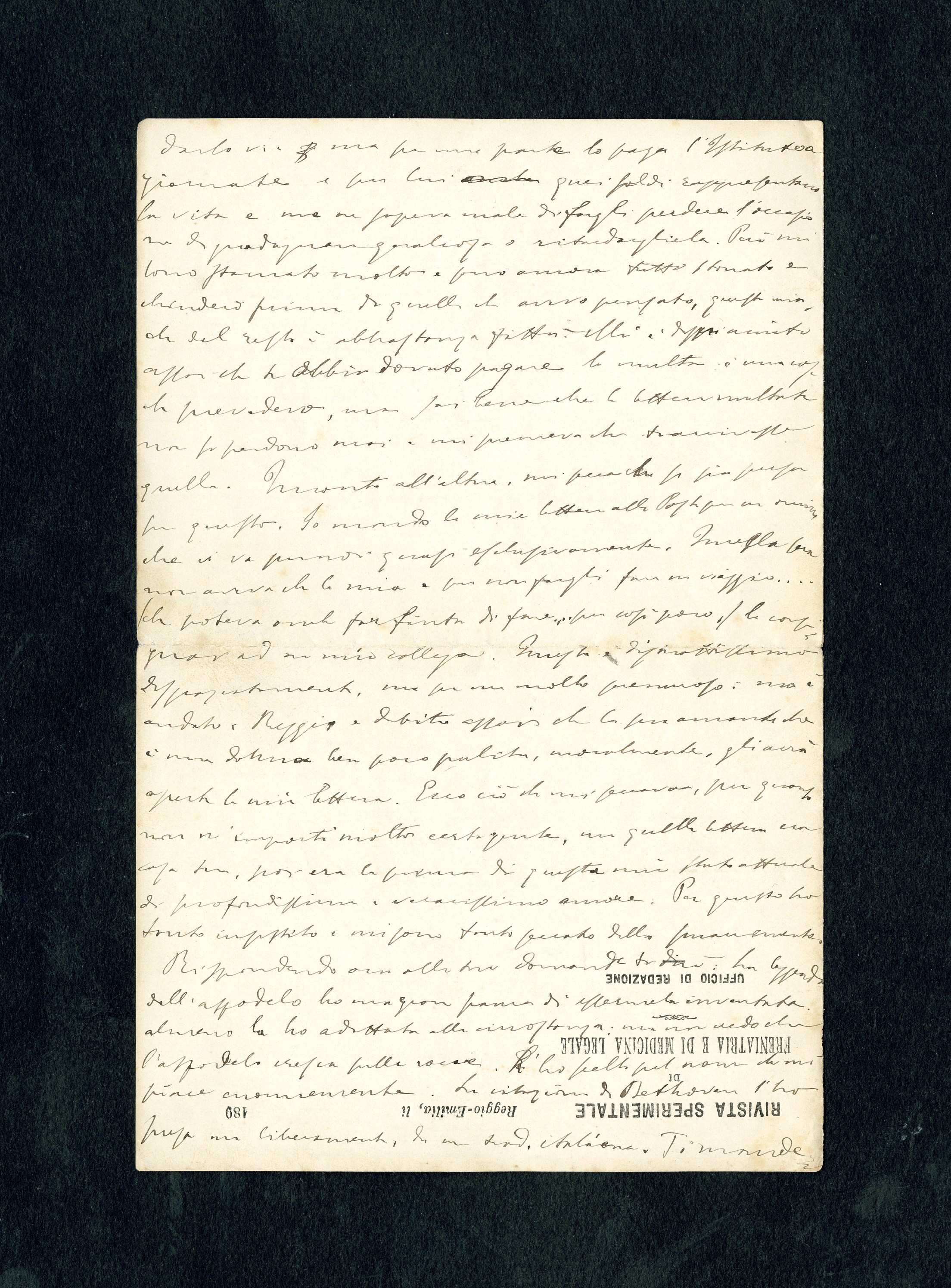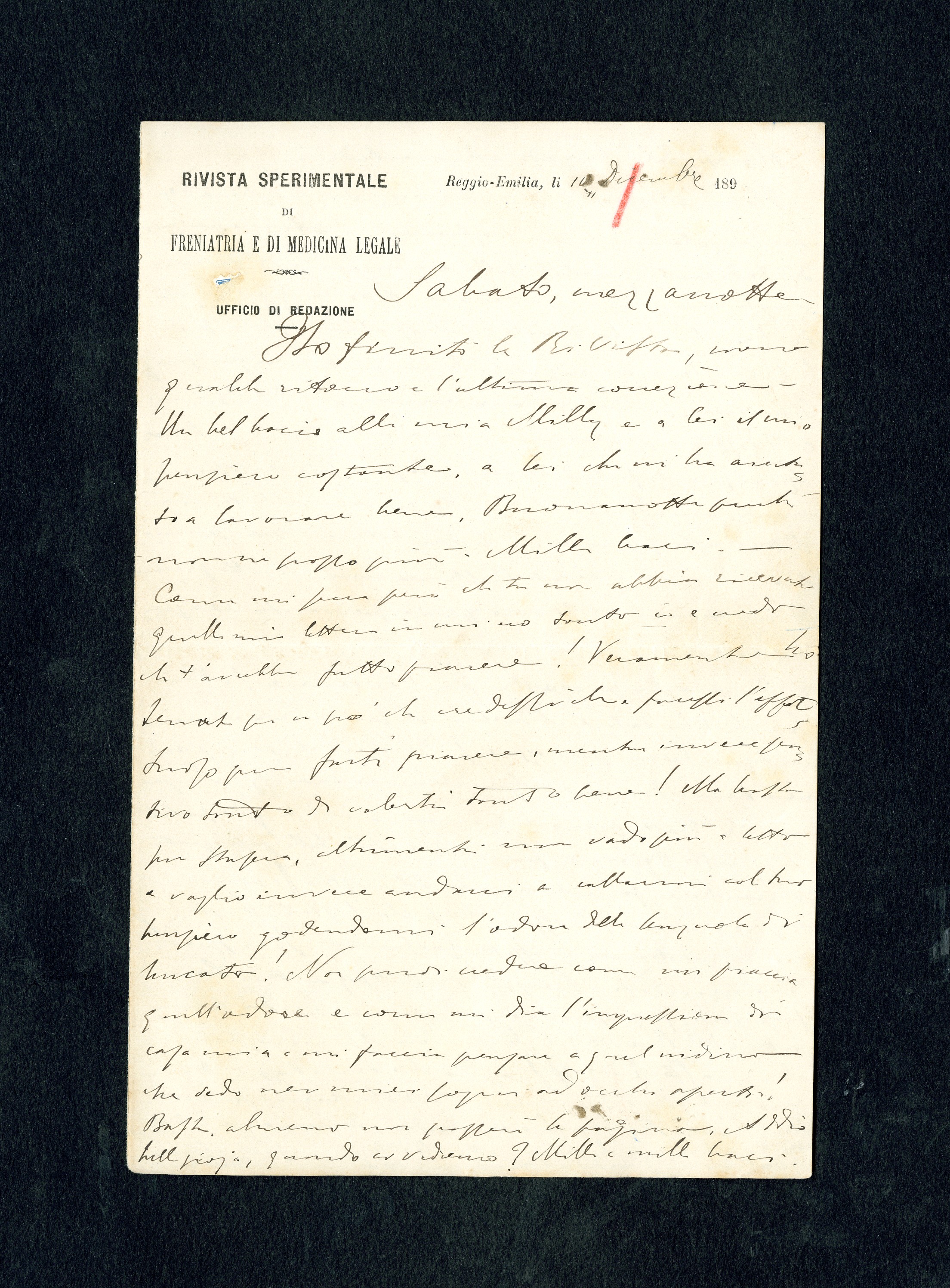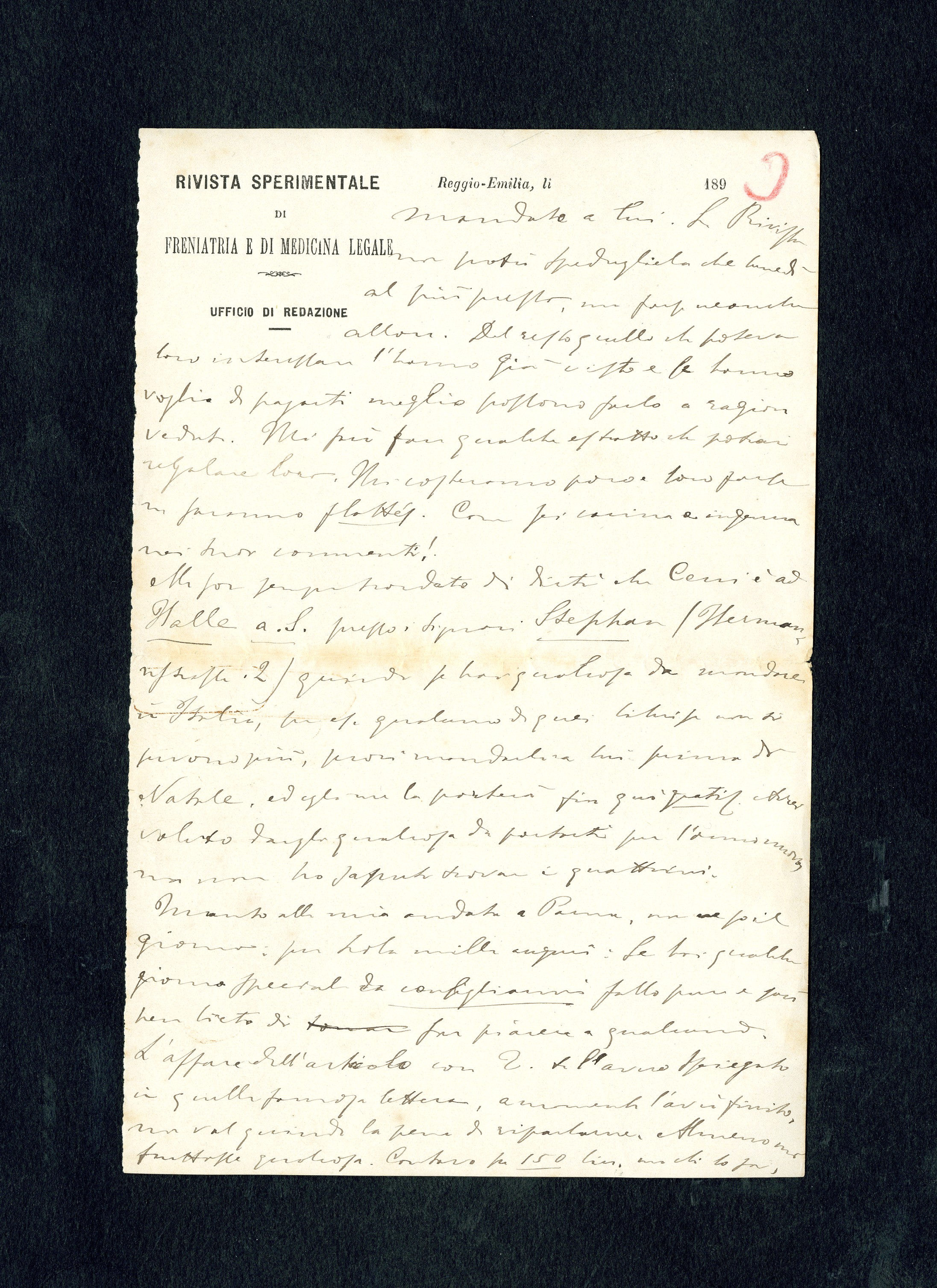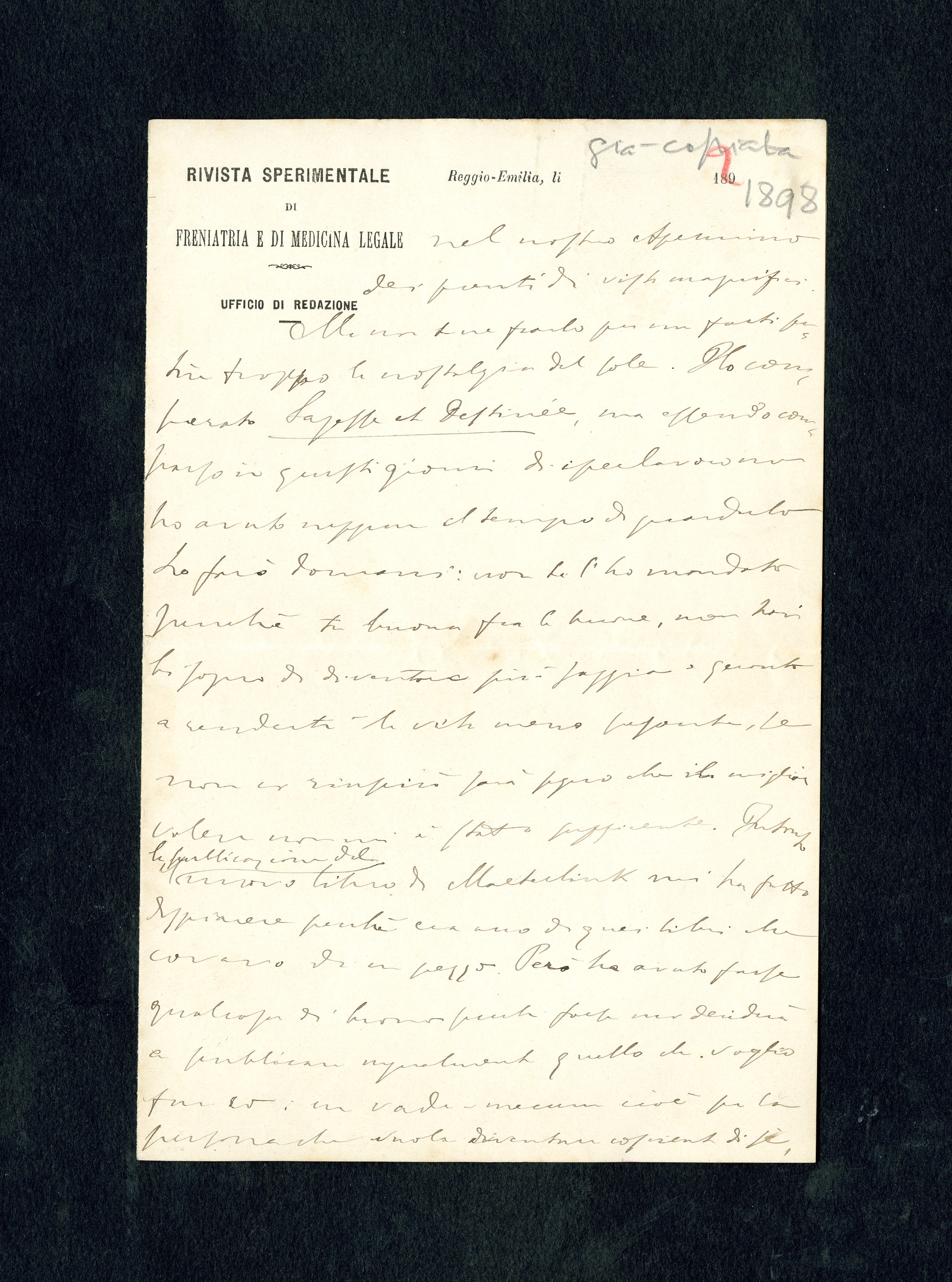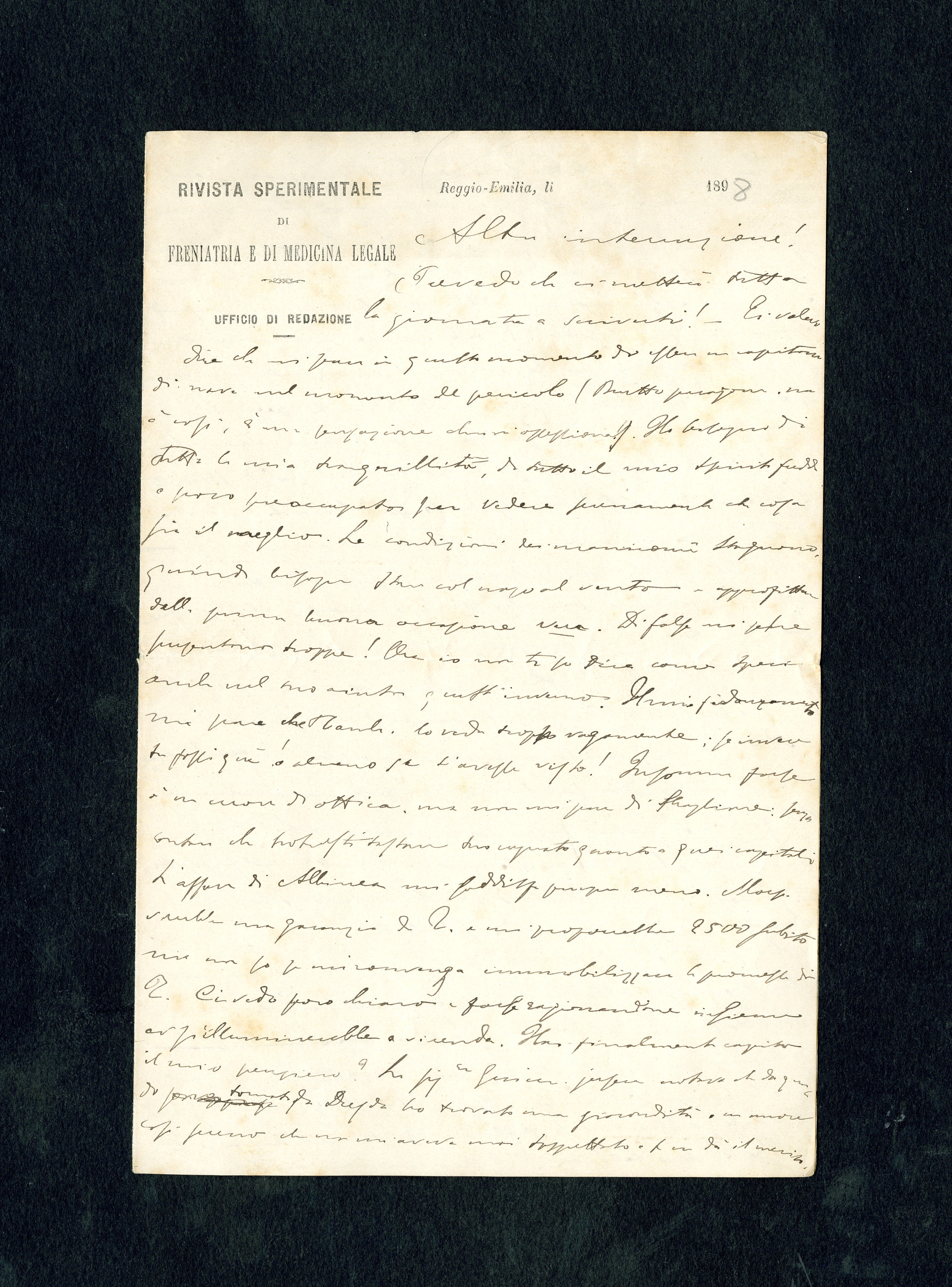 Carta intestata: "Rivista sperimentale / di / freniatria e di medicina legale / ufficio di redazione; Frenocomio / di / Reggio nell’Emilia / Direzione medica."