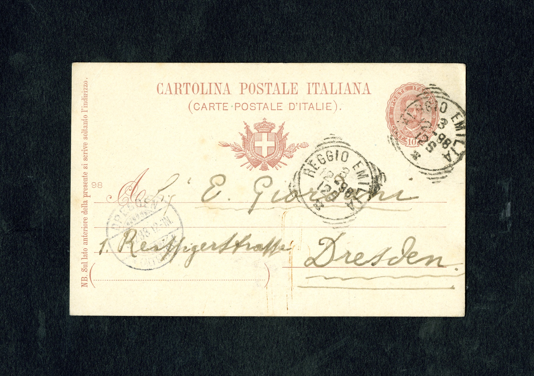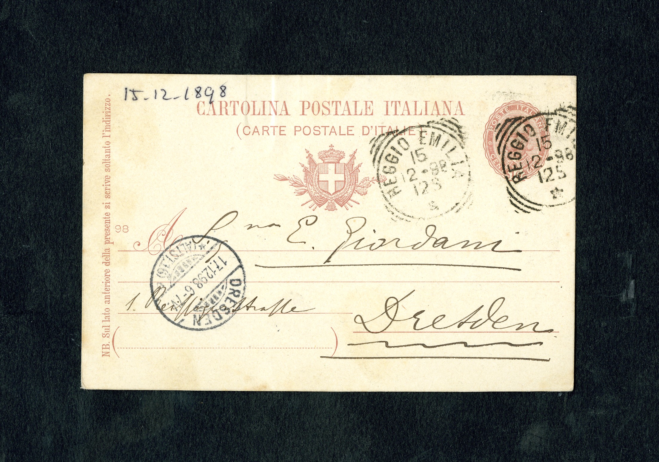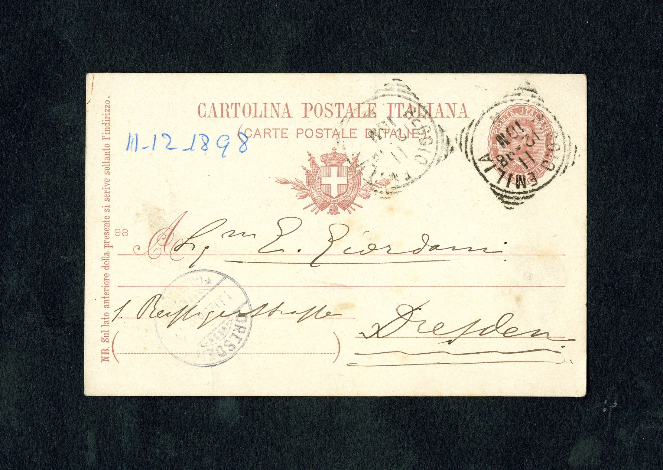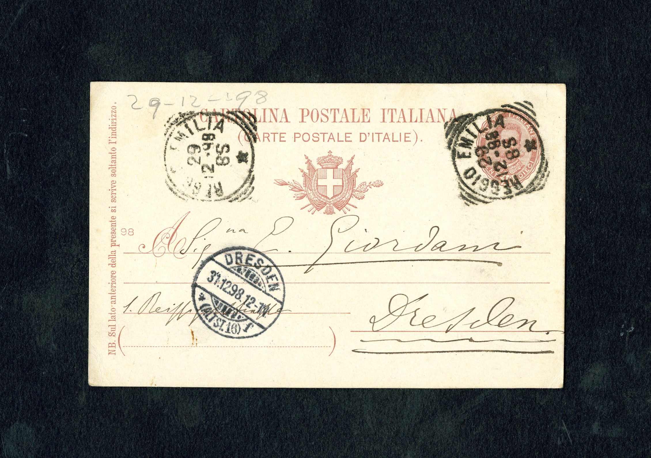 1) Reggio Emilia, 3 dicembre 1898: si dice commosso della lettera che ha ricevuto e la tranquillizza spiegando che le parole “chi non mi capisce, suo danno” [scritta nella cartolina del 25 novembre] non erano riferite a lei ma “alle persone colle quali tratto”. Racconta di essere molto impegnato per la correzione dell’"articolo musicale" e per l’articolo con Tamburini, scritto per soldi ma in realtà rivelatosi poco conveniente, e si scusa di non aver mandato le bozze. Le spiega che per finire il lavoro con Tamburini e far uscire la Rivista non potrà scriverle una lettera prima del 12 dicembre. Le comunica che il suo ritratto è piaciuto molto a casa Tamburini e che la bambina, Augusta, gli ha chiesto delle cartoline illustrate e per questo la prega di inviagliene alcune da Dresda usando i marchi di Calderoni. Notifica che i cospicui impegni non gli hanno permesso di stringere subito il contratto con “quelli di Milano per la traduzione”.
