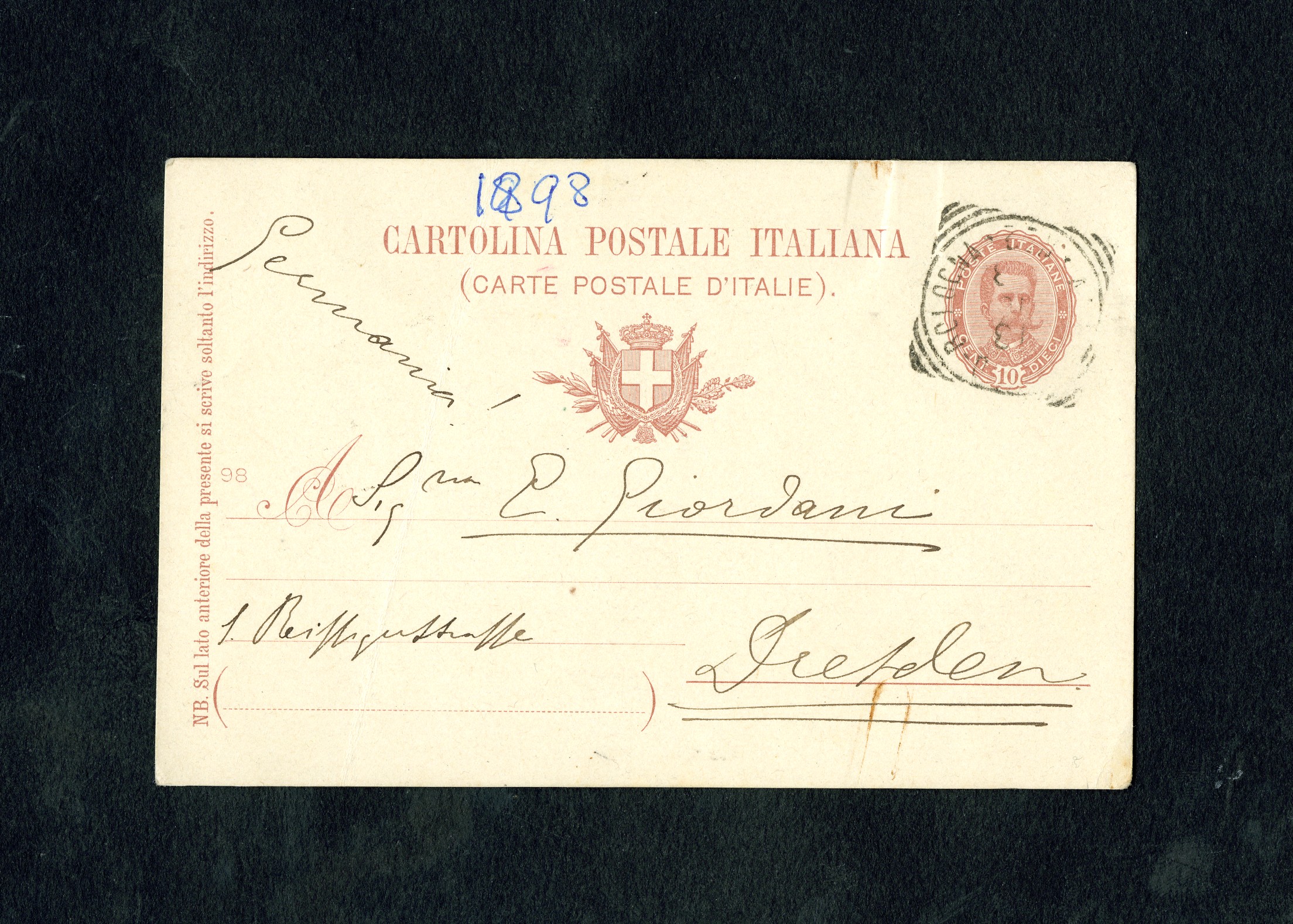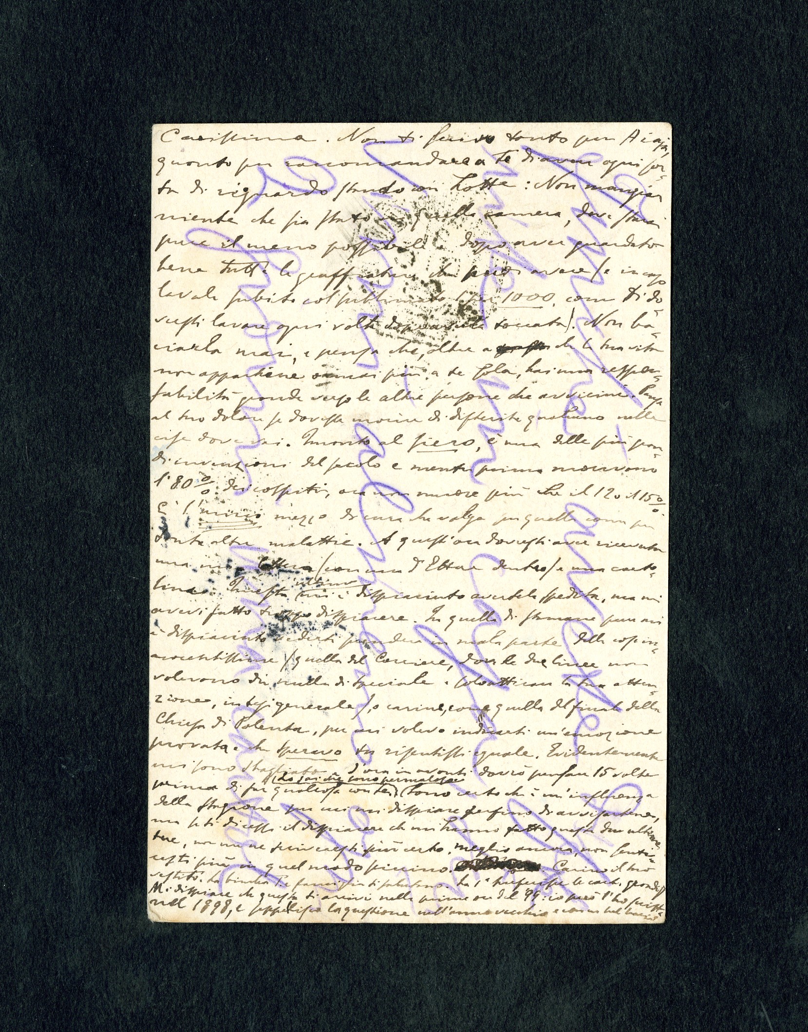 11) Reggio Emilia, 29 dicembre 1898: le scrive per indicarle “ogni sorta di riguardo” stando con “Lotte”: la bambina ha contratto la difterite ed è necessario, spiega, non mangiare nulla che sia stato in quella stanza, controllare di non avere graffi ma, nel caso, disinfettarli con “sublimato 1 per 1000” e soprattutto non baciarla mai poiché è responsabile non soltanto della sua vita ma di quella di diverse persone con cui entra in contatto. Le racconta che il siero “è una delle più grandi invenzioni del secolo” e che, se prima moriva l’80% dei contagiati, con il nuovo medicinale la mortalità era scesa al 12-15%. Si scusa per averle scritto poco prima una cartolina dura, ma le confessa di essersi dispiaciuto per quanto letto nella sua lettera. Porge gli auguri di buon anno.