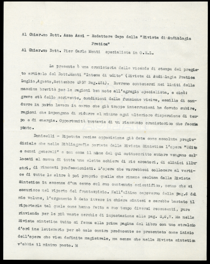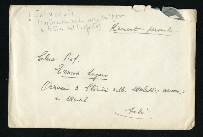 1) Torino, 15 settembre 1939. Lettera dattiloscritta del professore Azzo Azzi al professore Ernesto Lugaro, che richiede chiarimenti in merito alla cura bulgara, descritta nelle dispense Appunti alle lezioni di clinica delle malattie nervose e mentali - Anno 1937, pagg. 137-138, raccolti dai dottori Ceruti e Ferrando. Allegata busta da lettera.
