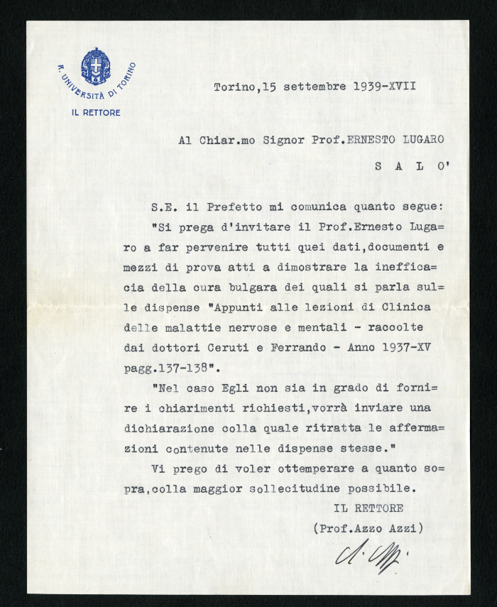 Scambio epistolare tra il professore Azzo Azzi, rettore della R. Università di Torino, e il professore Ernesto Lugaro, ordinario di clinica delle malattie nervose e mentali: