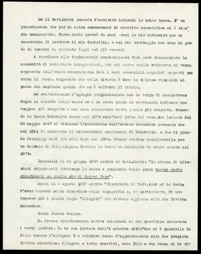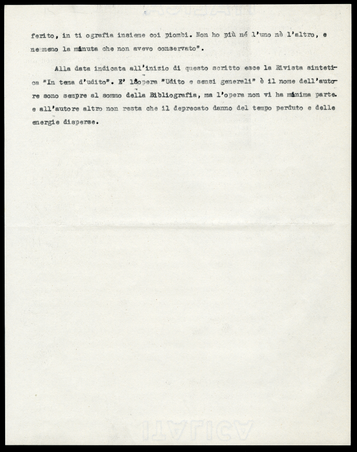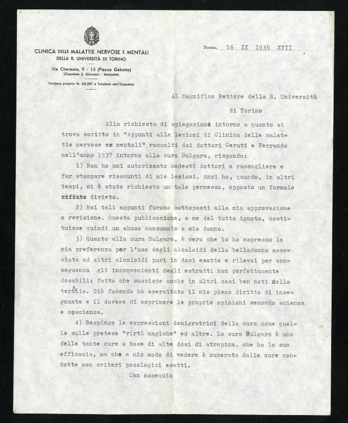 2) Torino, 16 settembre 1939. Risposta dattiloscritta del professore Ernesto Lugaro al rettore della R. Università di Torino, in cui sottolinea il fatto di non aver mai autorizzato la stampa dei riassunti delle sue lezioni, che pertanto non risulta nè approvata nè sottoposta a revisione da parte sua; riconosce, per quanto riguarda la cura bulgara, di aver preferito l'uso degli alcaloidi della belladonna associata ad altri alcaloidi puri in dosi esatte e, infine, respinge il riconoscimento del valore magico della cura bulgara.