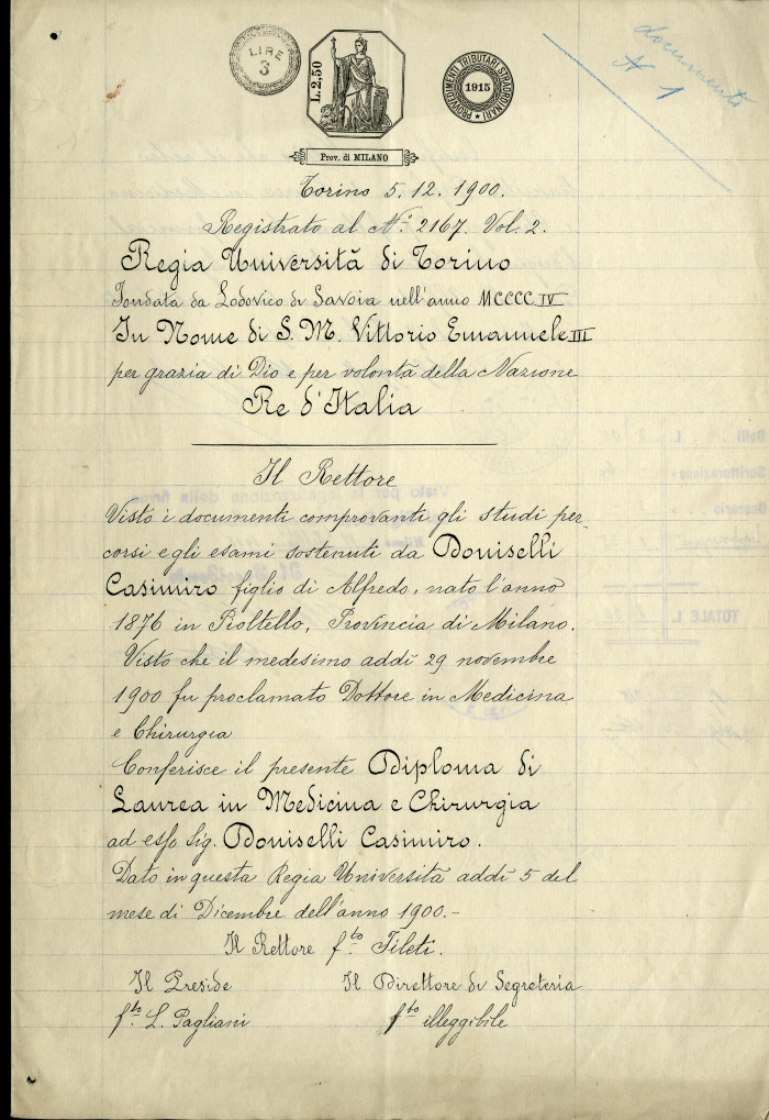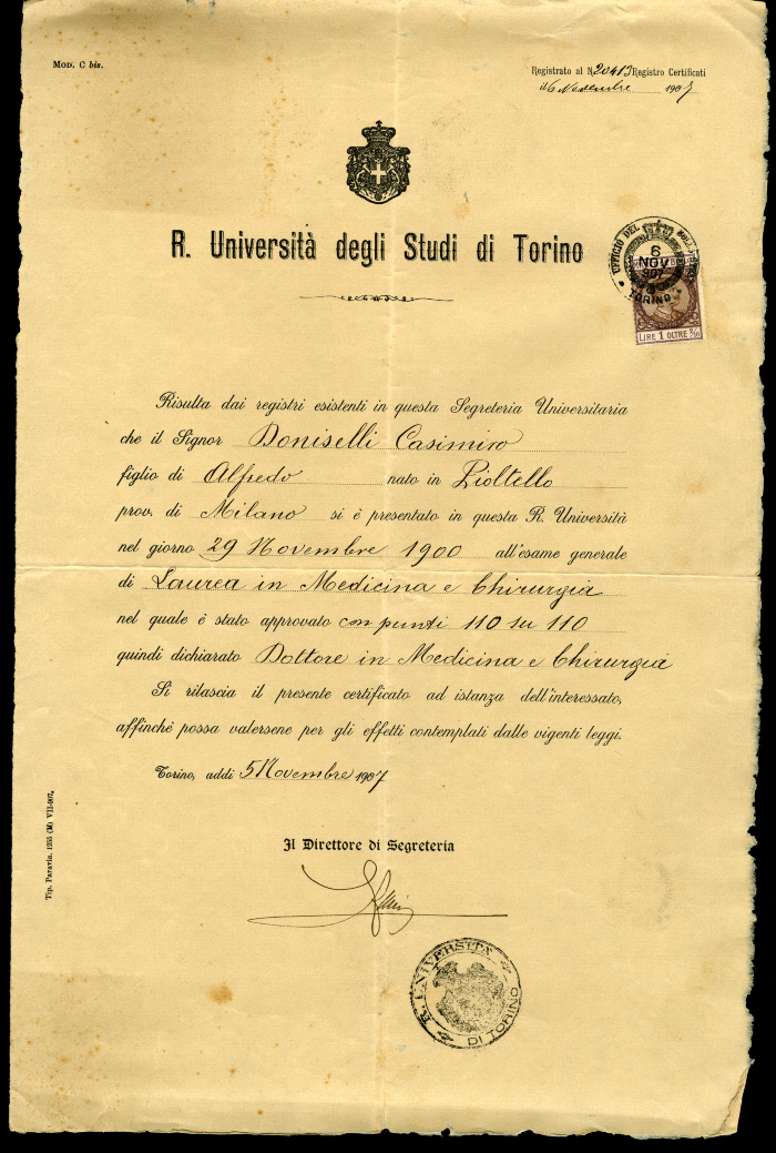 3 certificati di laurea in Medicina e chirurgia, conseguita il 29 novembre 1900, rilasciati a Casimiro Doniselli dall'Università degli studi di Torino: 1 certificato rilasciato il 12 settembre 1902, con indicazione degli esami sostenuti e della relativa votazione; 1 certificato rilasciato il 5 novembre 1907, con indicazione del voto di laurea di 110 punti; 1 certificato rilasciato il 17 febbraio 1918.