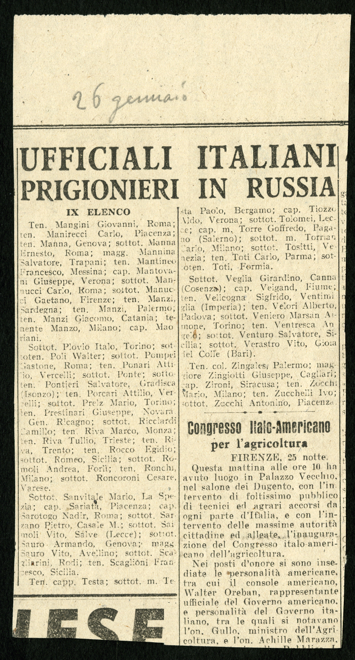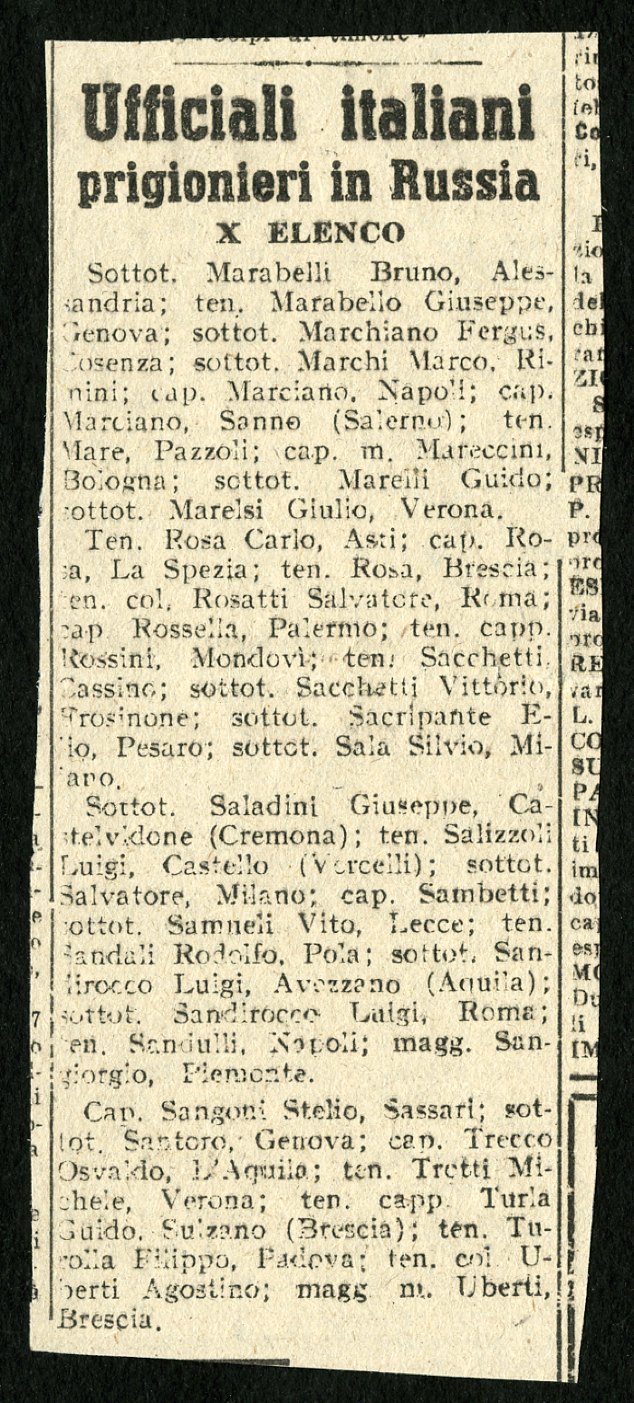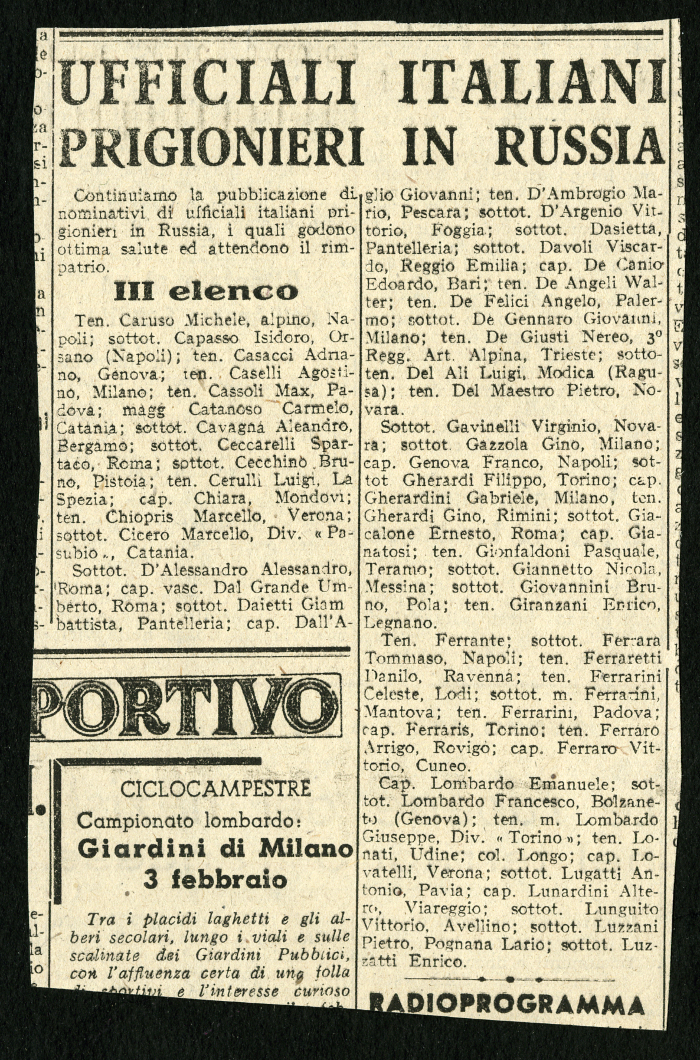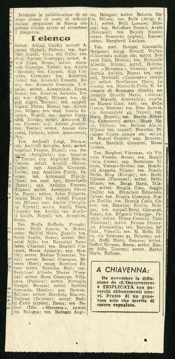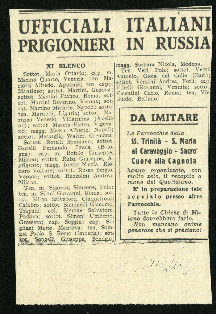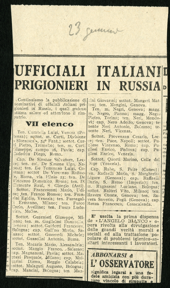 1) 12 elenchi pubblicati nel gennaio 1946 su vari giornali, tra cui "L'Osservatore", degli ufficiali italiani prigionieri in Russia