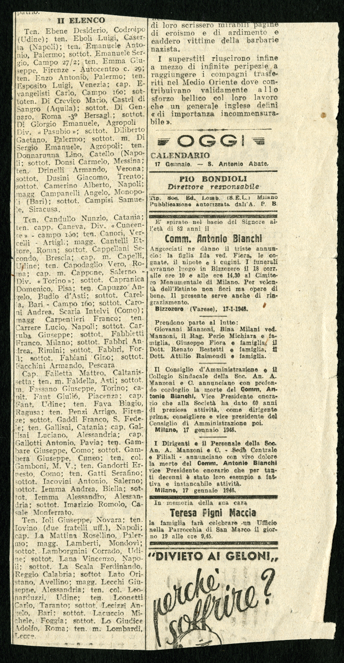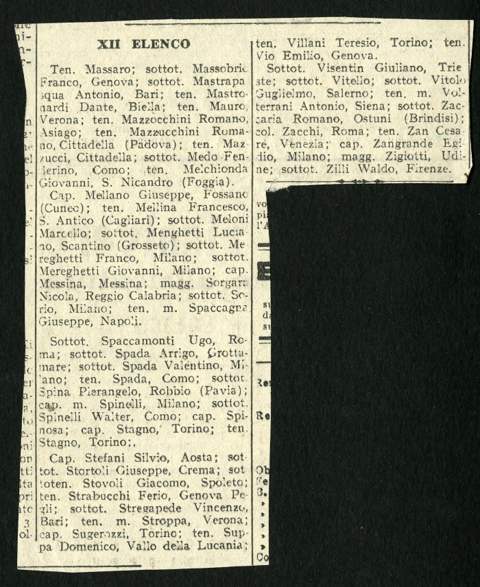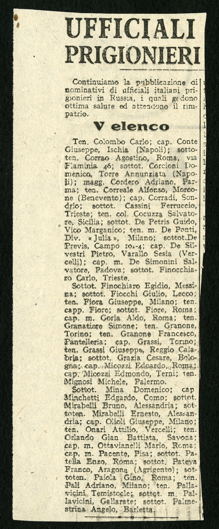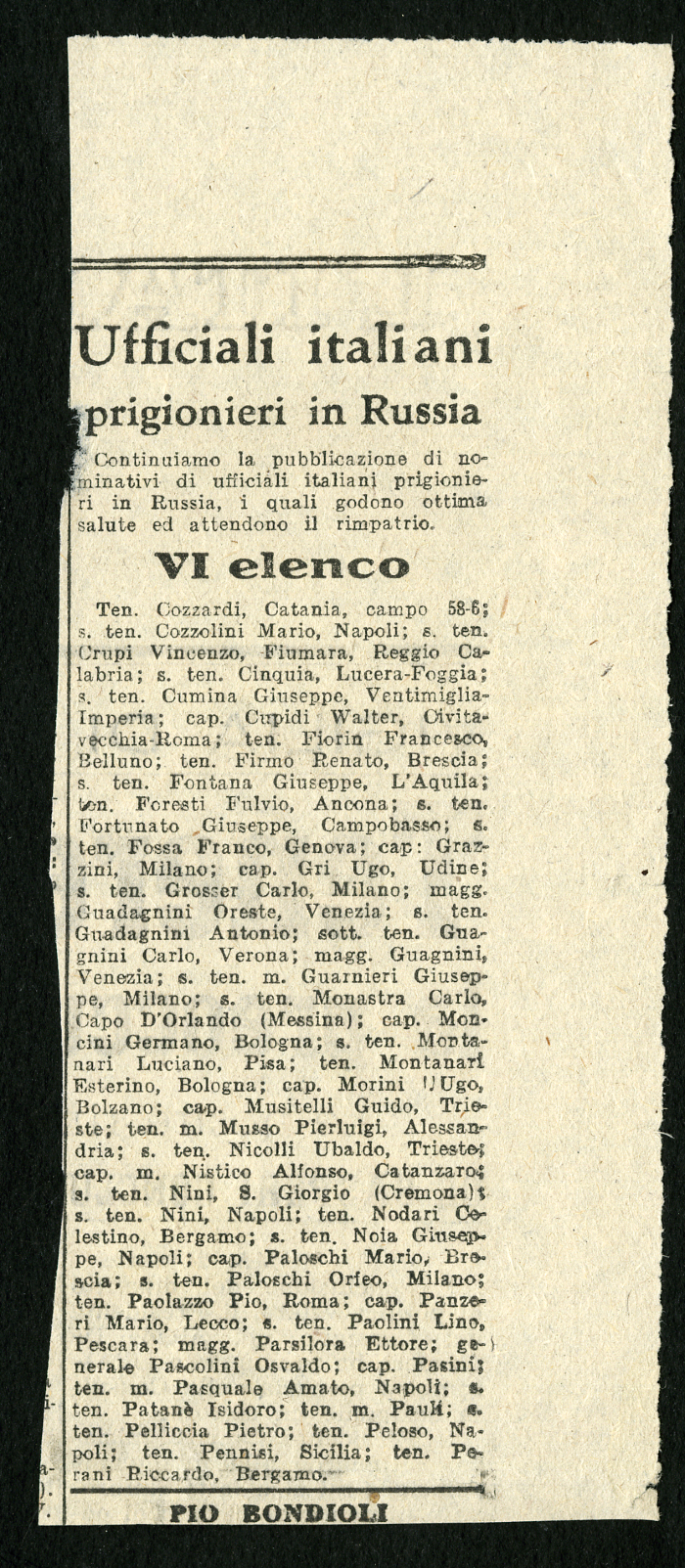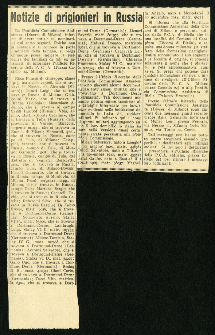 1) 12 elenchi pubblicati nel gennaio 1946 su vari giornali, tra cui "L'Osservatore", degli ufficiali italiani prigionieri in Russia
