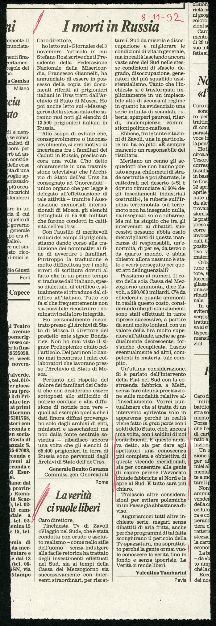 15) Valentino Tamburini, "I morti in Russia", in [s.n.], 8 novembre 1992