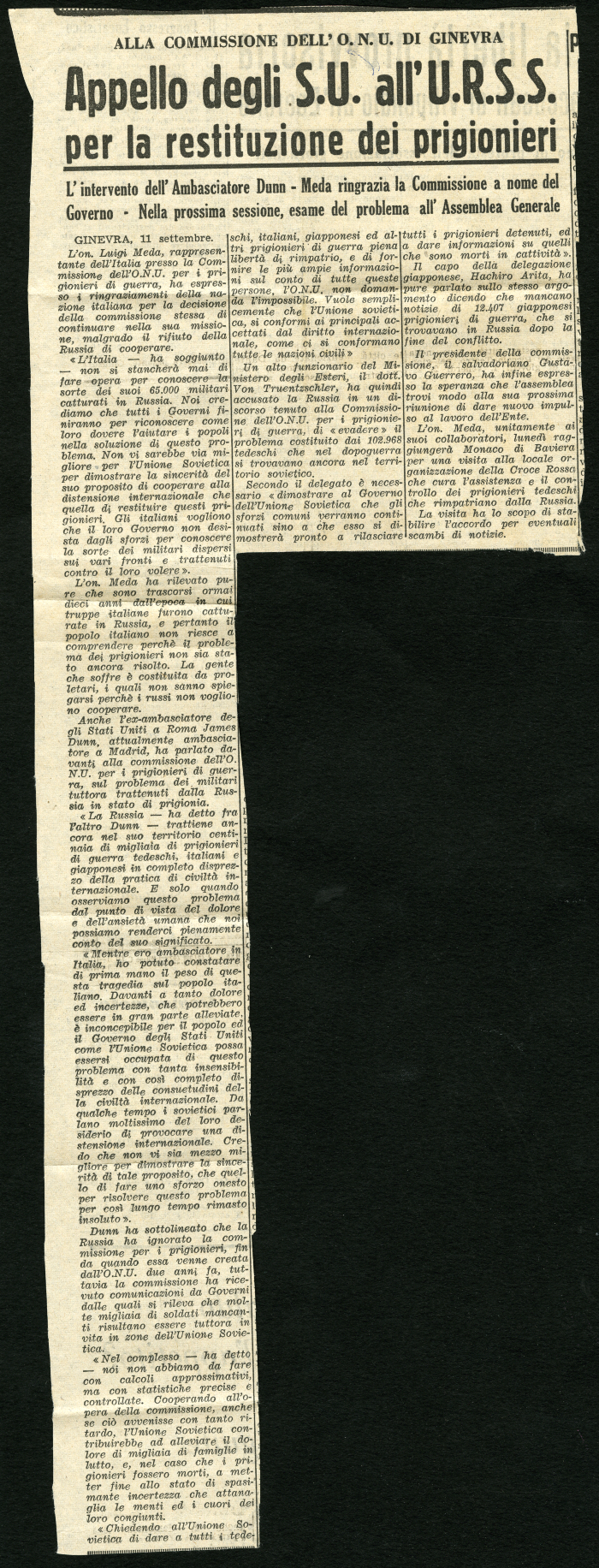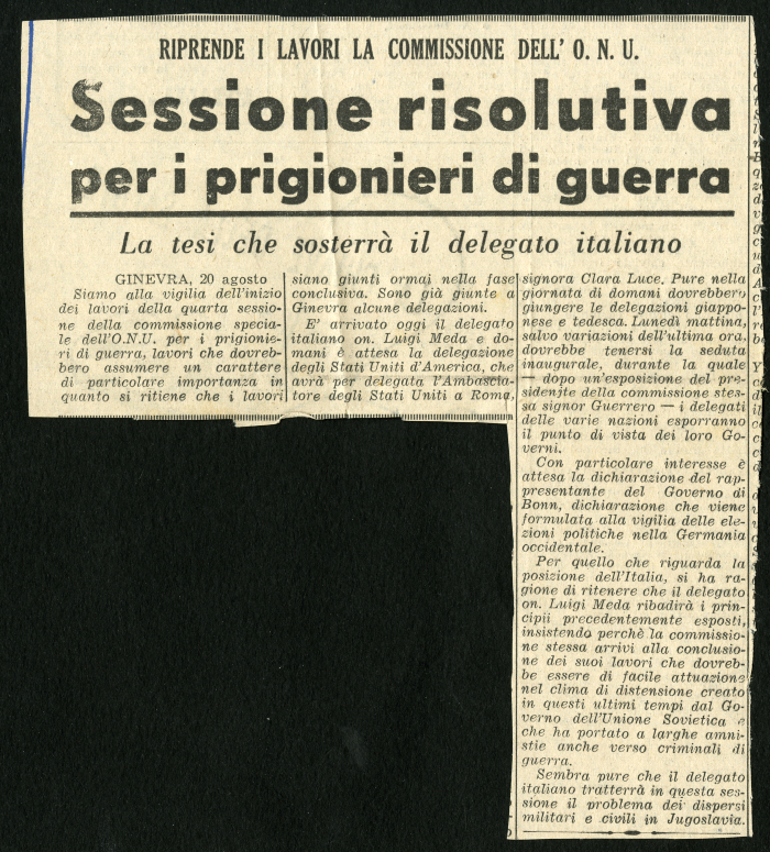 19) "Alla Commissione dell'Onu di Ginevra. Appelli degli S.U. all'URSS per la restituzione dei prigionieri", in [s.n.], 11 settembre [s.a.]