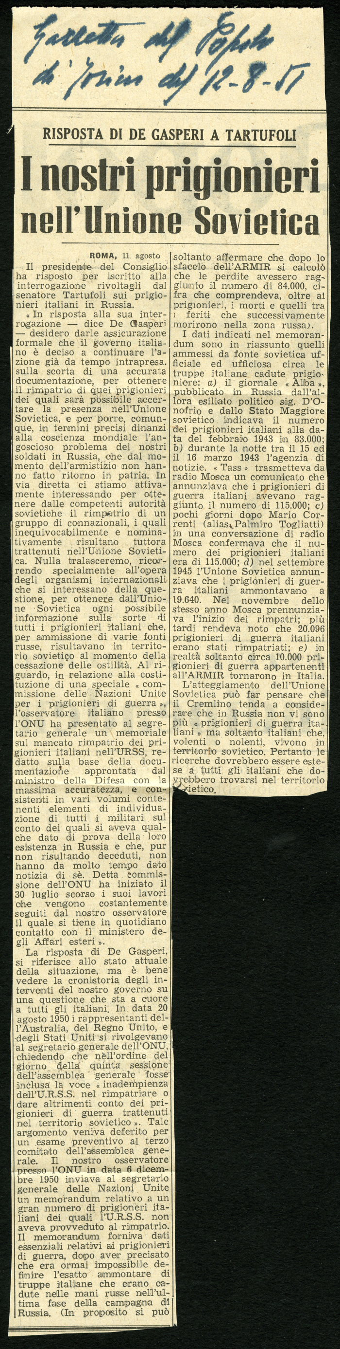 9) "Risposta De Gasperi a Tartufoli. I nostri prigionieri nell'Unione Sovietica", in "Gazzetta del Popolo di Torino", 12 agosto 1951