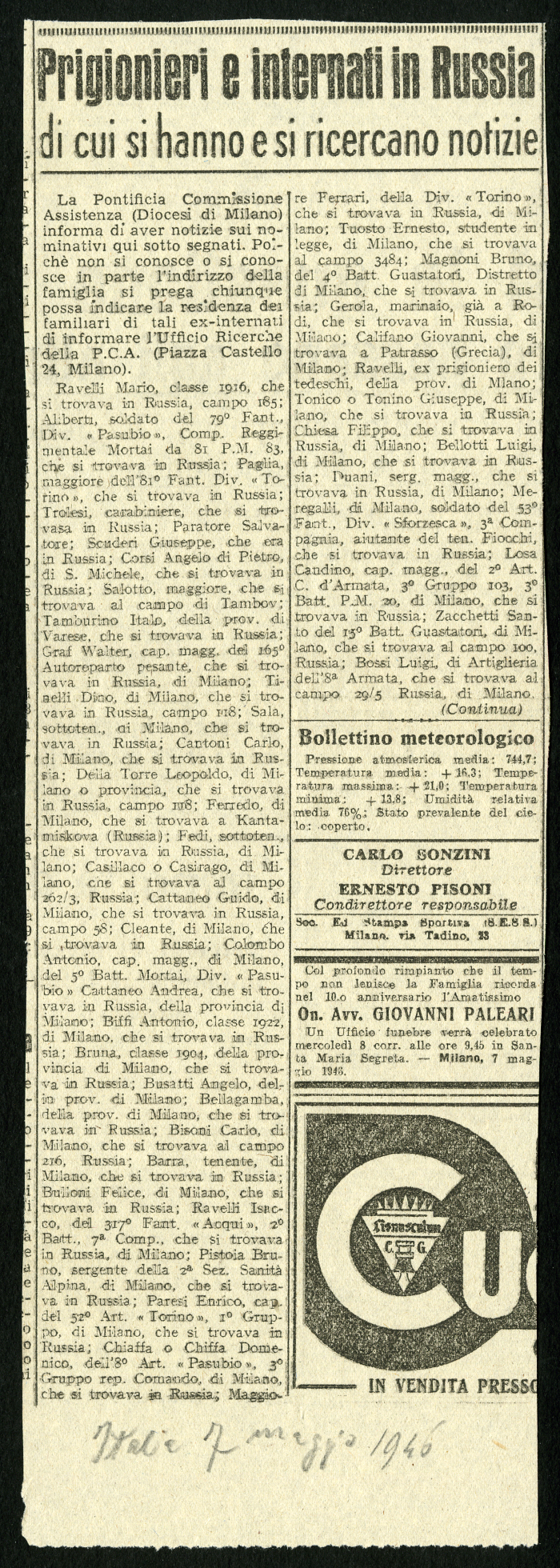 4) "Prigionieri e internati in Russia di cui si hanno e si ricercano notizie", in "Italia", 7 maggio 1946