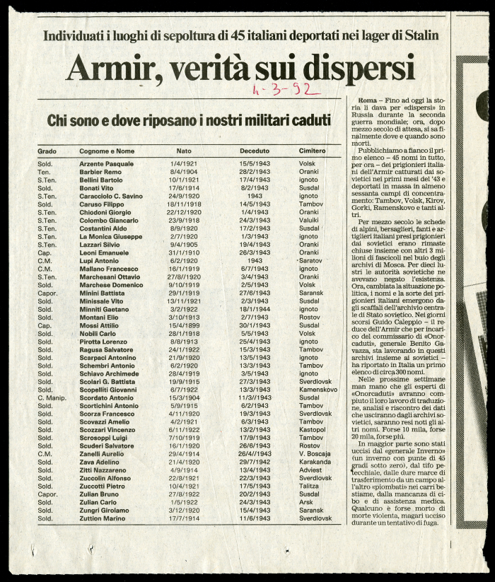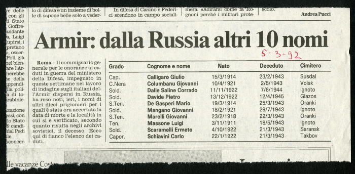 13) "Armir: dalla Russia altri 10 nomi", in [s.n.], 5 marzo 1992