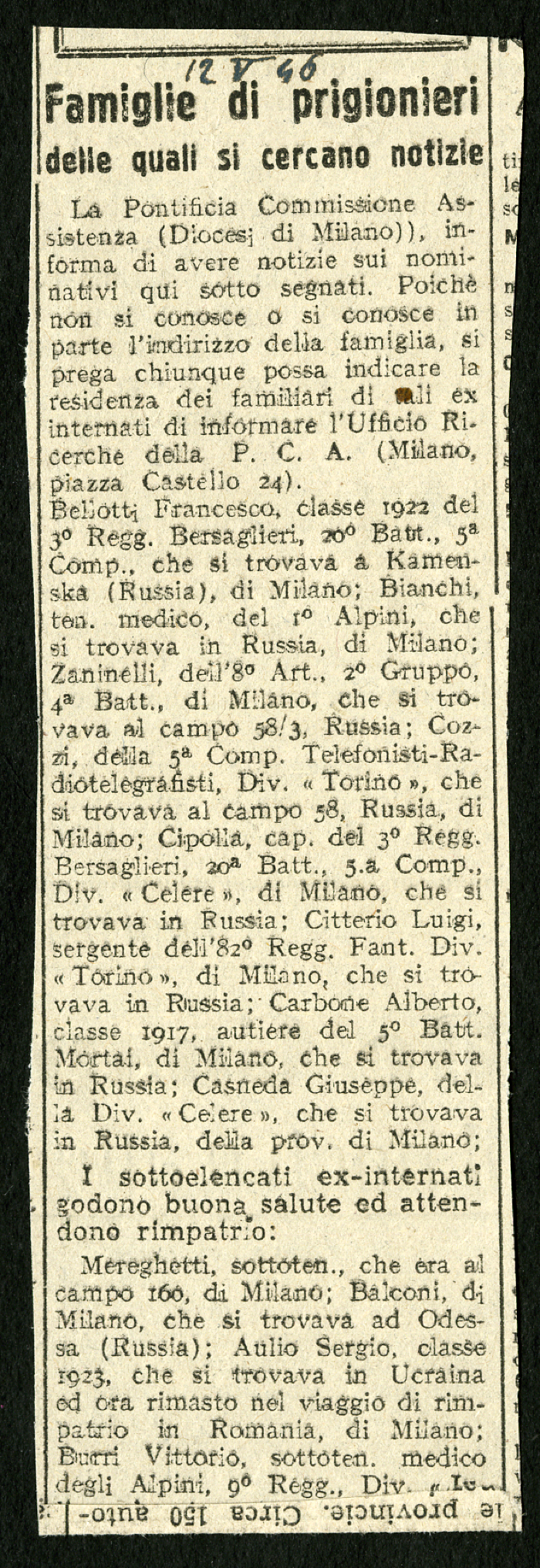 5) "Famiglie di prigionieri delle quali si cercano notizie", in [s.n.], 12 maggio 1946