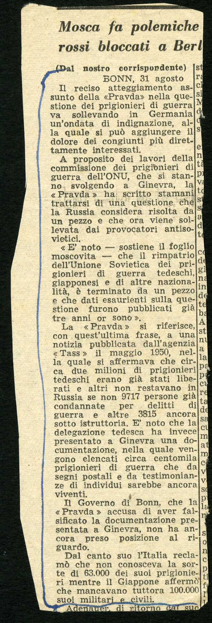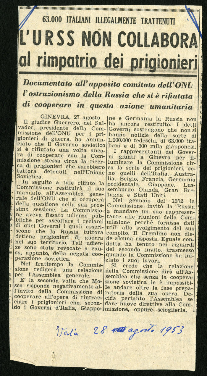 11) "63.000 italiani illegalmente trattenuti. L'URSS non collabora al rimpatrio dei prigionieri", in "Italia", 28 agosto 1953
