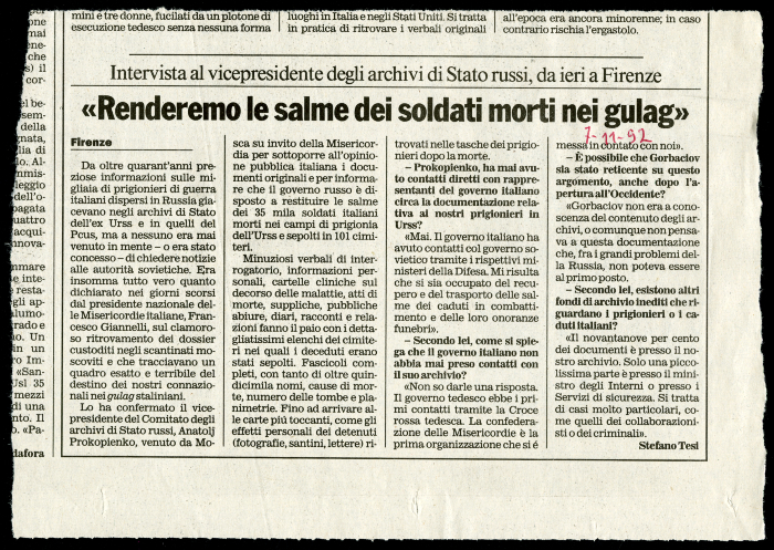 14) Stefano tesi, "Intervista al vicepresidente degli archivi di stato russi, da ieri a Firenze. «Renderemo le salme dei soldati morti nei gulag»", in [s.n.], 7 novembre 1992