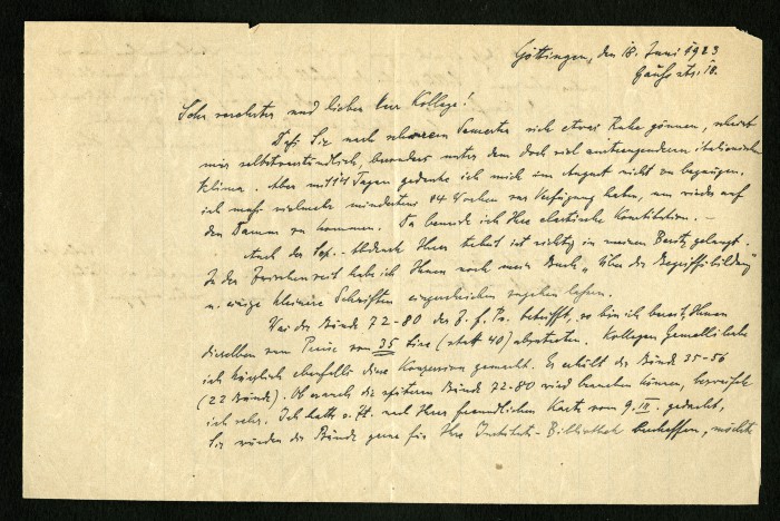 Lettera di Narziss Ach a Federico Kiesow, in tedesco (Göttingen,18 giugno 1923), in cui afferma di aver ricevuto il suo saggio e di avergli inviato il suo libro “Über die Begriffsbildung”, si dice pronto a spedirgli i volumi 7280 della “Zeitschrift für Psychologie” al prezzo di lire 30 anziché 40, come ha già fatto con Agostino Gemelli al quale ha mandato 22 volumi, infine lo informa sulle modalità di pagamento.