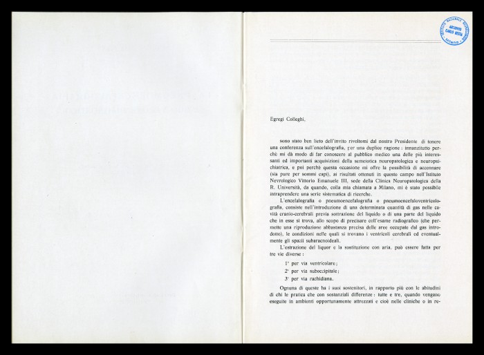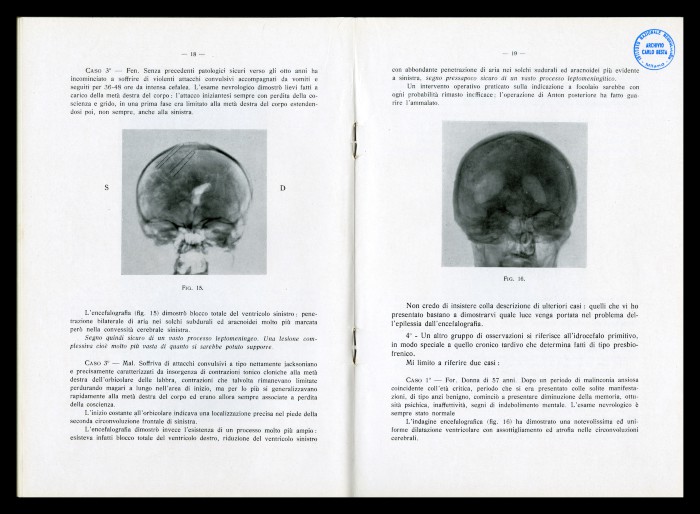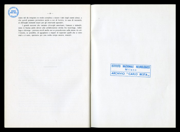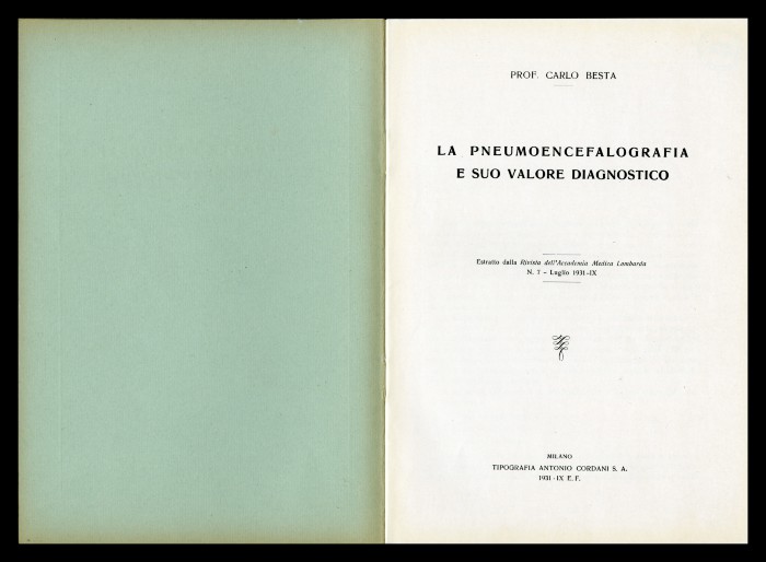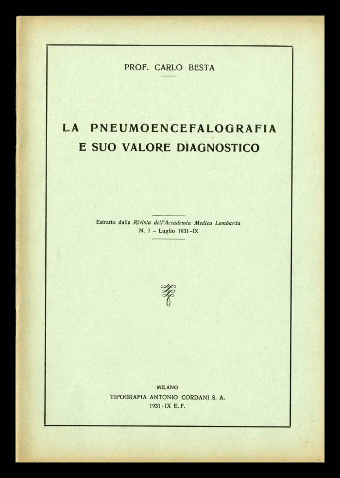 Opuscolo: Carlo Besta, "La pneumoencefalografia e suo valore diagnostico" (Milano, tipografia Antonio Cordani, 1931, pp. 34; estratto da "Rivista dell'Accademia medica lombarda", luglio 1931, IX, n. 7).