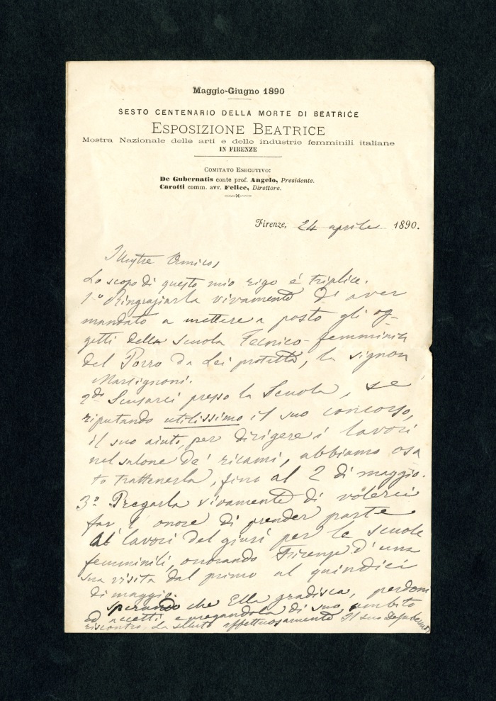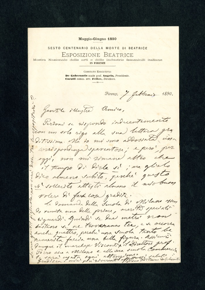 Carta intestata: “Maggio-Giugno 1890/Sesto centenario della morte di Beatrice / Esposizione Beatrice / Mostra Nazionale delle arti e delle industrie femminili italiane / in Firenze / Comitato esecutivo / De Gubernatis conte prof. Angelo, presidente / Carotti comm. avv. Felice, direttore”.