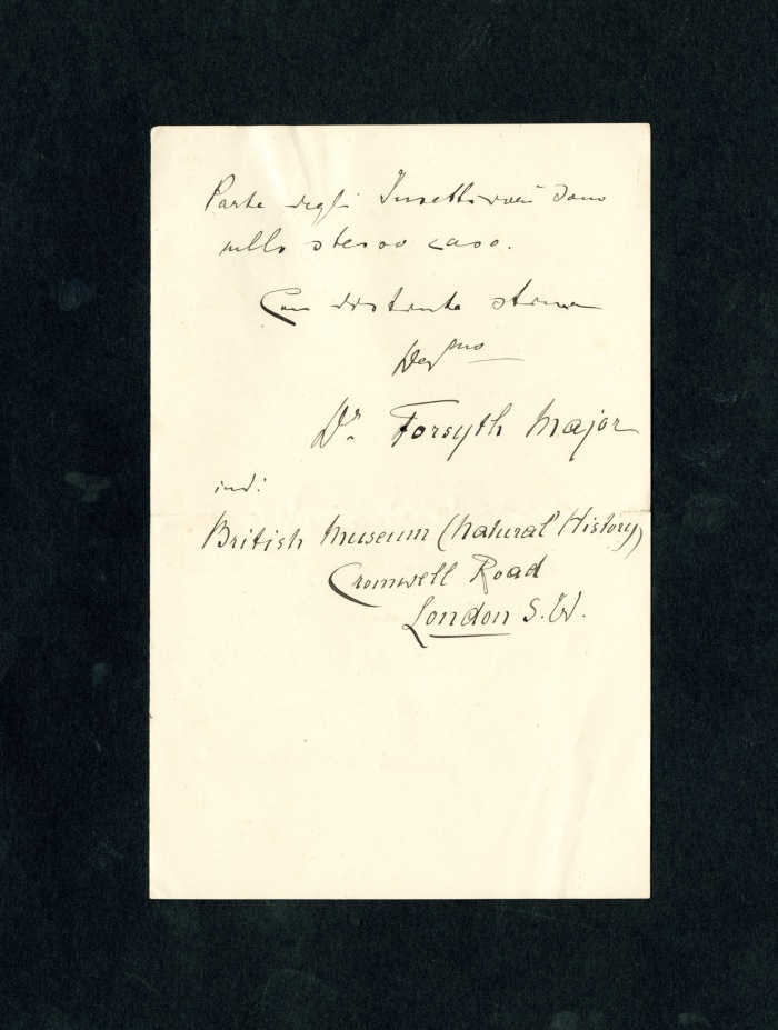 1 lettera dello zoologo e paleontologo svizzero Charles Immanuel Forsyth Major (1843-1923):