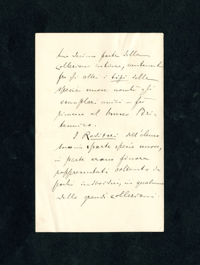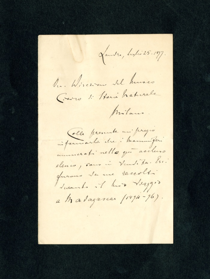 Londra, 25 luglio 1897: scrive che i mammiferi nell’elenco trasmessogli sono in vendita e furono da lui raccolti durante un viaggio in Madagascar (1894-1896). Una decima parte dell’intera collezione, contenente anche specie nuove ed esemplari unici, si trovano al museo britannico [Natural History Museum].