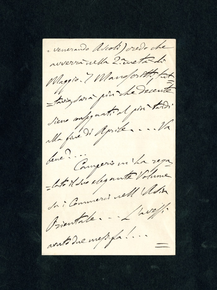 S.l., 14 marzo 1898: esprime dispiacere per non avere il biglietto in cui si parlava dell’articolo in onore di Cattaneo a causa del servizio postale. Attende la pubblicazione del numero, cui il prof. Ascoli ha promesso di collaborare di nuovo, entro la metà di maggio; pertanto i manoscritti saranno da consegnare entro fine aprile.