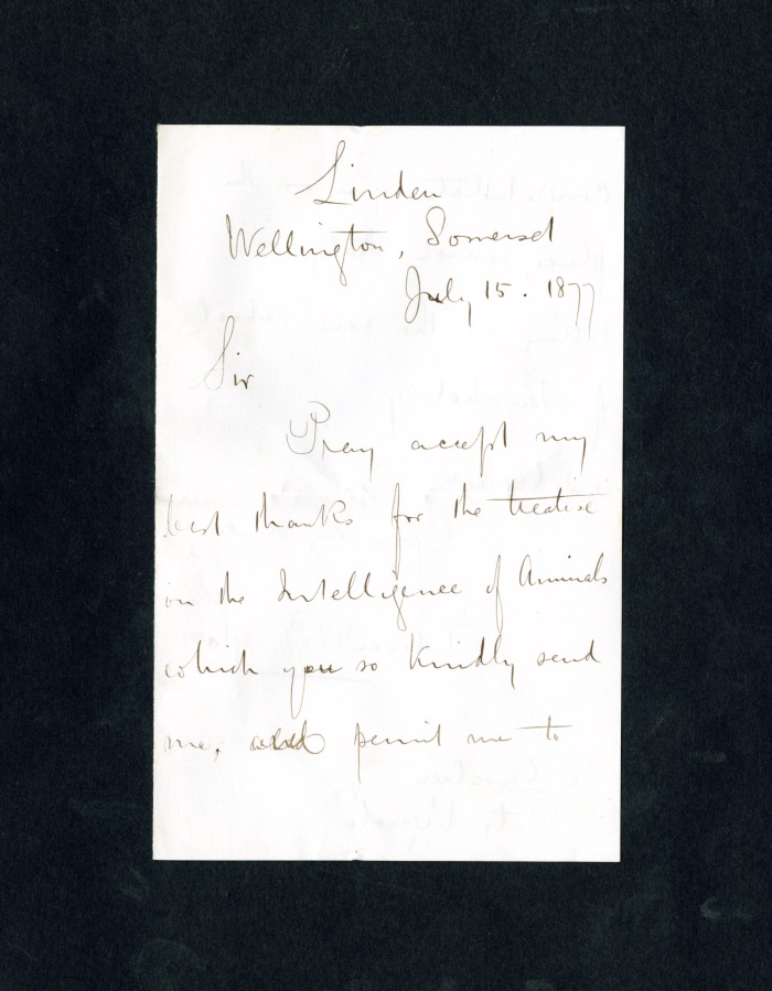Wellington Somerset, 15 luglio 1877: lo ringrazia per il dono del suo trattato sull’intelligenza del mondo animale e si congratula per il posto di insegnante nella scuola di psicologia.