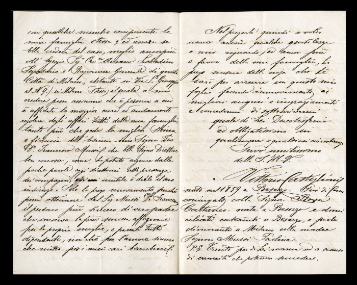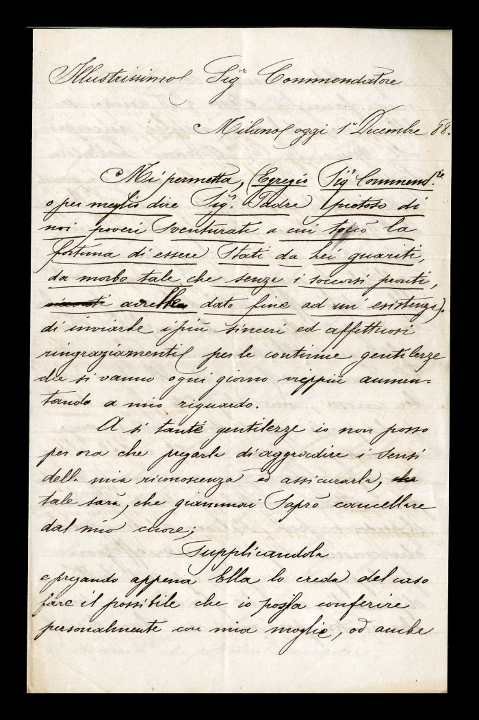 1) Milano, 01.12.1888: Castiglioni, in cura da Biffi, lo ringrazia per le continue attenzioni nei suoi riguardi e gli chiede, se possibile, di metterlo in contatto con la moglie, Rosa Cattaneo, o con un altro membro della sua famiglia nonché con Ausano Labadini, segretario e ragioniere generale del Comune di Milano, che si occupa degli affari della sua famiglia e gode della stima di suo zio, Francesco Mussi.